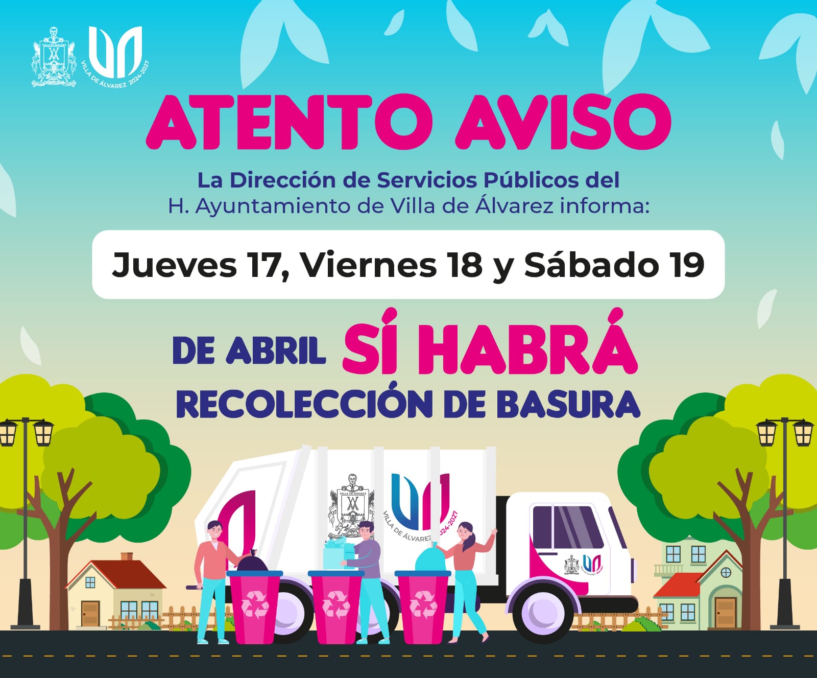 Villa de Álvarez, Col.- El Ayuntamiento de Villa de Álvarez, a través de la Dirección de Servicios Públicos, informa a la población que los días jueves 17, viernes 18 y sábado 19 de abril de la Semana Santa, la recolección de basura en las colonias y comunidades del municipio se realizará de manera normal.