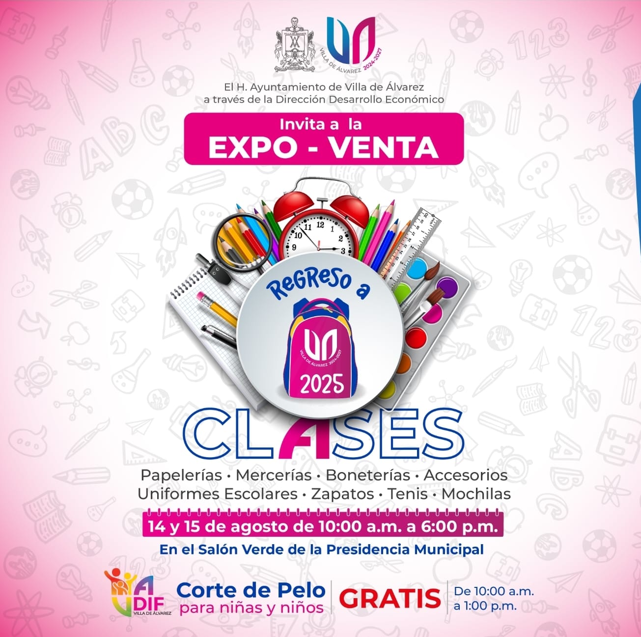 En la Gran Expo Venta de Regreso a Clases 2025 las familias encontrarán artículos de papelería, bonetería, mercería, accesorios, uniformes escolares, zapatos, tenis y mochilas a los mejores precios y con excelentes descuentos; además se ofrecerá el servicio de corte de cabello gratis para niñas y niños.