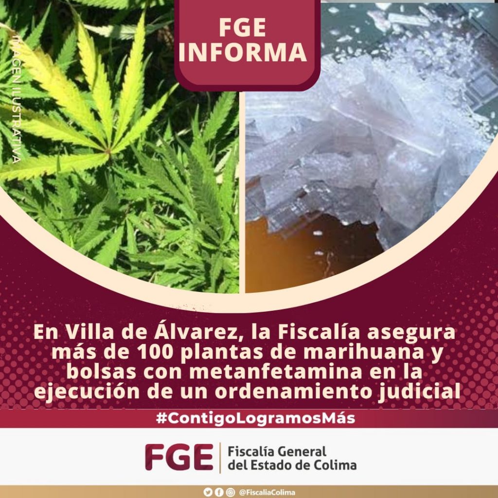 Continuando con la estrategia contra la delincuencia y el narcomenudeo en la entidad, la Policía Investigadora de la Fiscalía General del Estado (FGE) cumplimentó una orden de cateo en un inmueble del municipio de Villa de Álvarez, donde localizó más de 100 plantas de marihuana, así como metanfetamina, motivo por el cual el inmueble quedó asegurado.