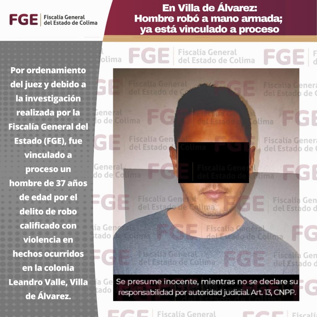 Por ordenamiento del juez y debido a la investigación realizada por la Fiscalía General del Estado (FGE), fue vinculado a proceso un hombre de 37 años de edad por el delito de robo calificado con violencia en hechos ocurridos en la colonia Leandro Valle, Villa de Álvarez.