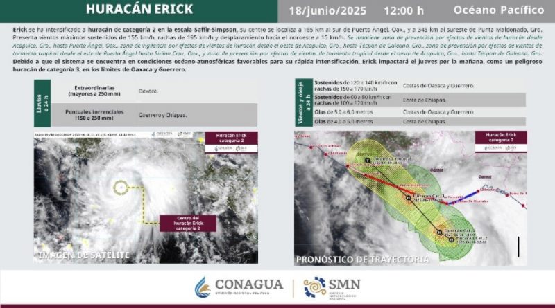 El organismo de la Comisión Nacional del Agua (Conagua) da a conocer que la tarde de este miércoles, ‘Érick’ se localiza a 165 kilómetros al sur de Puerto Ángel Oaxaca y a 345 kilómetros al sureste de Punta Maldonado Guerrero, con vientos máximos sostenidos de 155 kilómetros por hora, rachas de 195 km/h y desplazamiento hacia el noroeste a 15 km/h.
