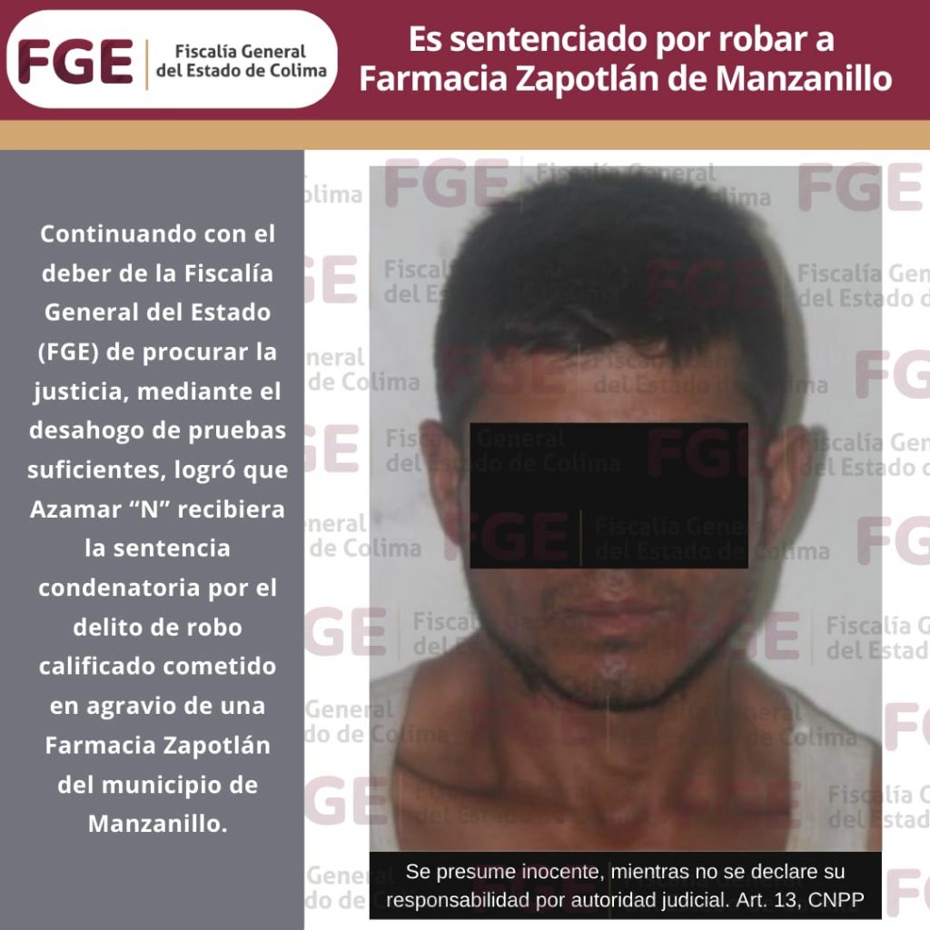 Continuando con el deber de la Fiscalía General del Estado (FGE) de procurar la justicia, mediante el desahogo de pruebas suficientes, logró que Azamar “N” recibiera la sentencia condenatoria por el delito de robo calificado cometido en agravio de una Farmacia Zapotlán del municipio de Manzanillo.