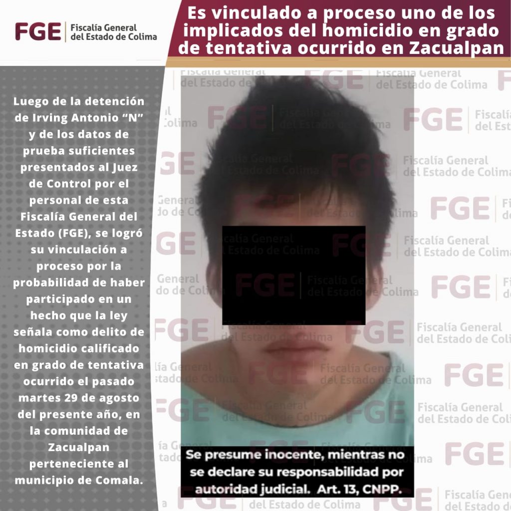 Luego de la detención de Irving Antonio “N” y de los datos de prueba suficientes presentados al Juez de Control por el personal de esta Fiscalía General del Estado (FGE), se logró su vinculación a proceso por la probabilidad de haber participado en un hecho que la ley señala como delito de homicidio calificado en grado de tentativa ocurrido el pasado martes 29 de agosto del presente año, en la comunidad de Zacualpan perteneciente al municipio de Comala.