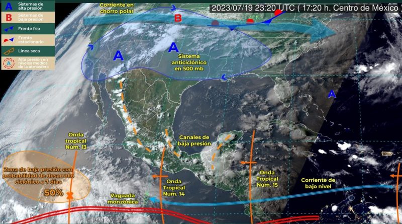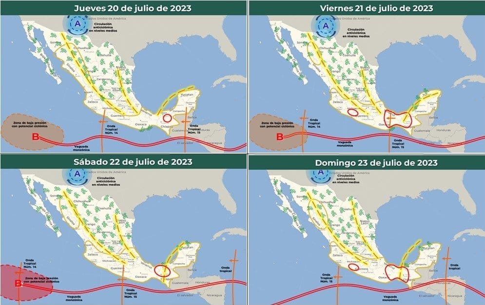 Para este jueves 20 de julio, el organismo de la Comisión Nacional del Agua (Conagua), estima que Colima podría alcanzar temperaturas máximas de hasta 40 grados Celsius, al igual que Durango, Sinaloa, Nayarit, Jalisco, Michoacán, Guerrero, Oaxaca, San Luis Potosí, Veracruz, Tabasco, Chiapas, Campeche, Yucatán y Quintana Roo.