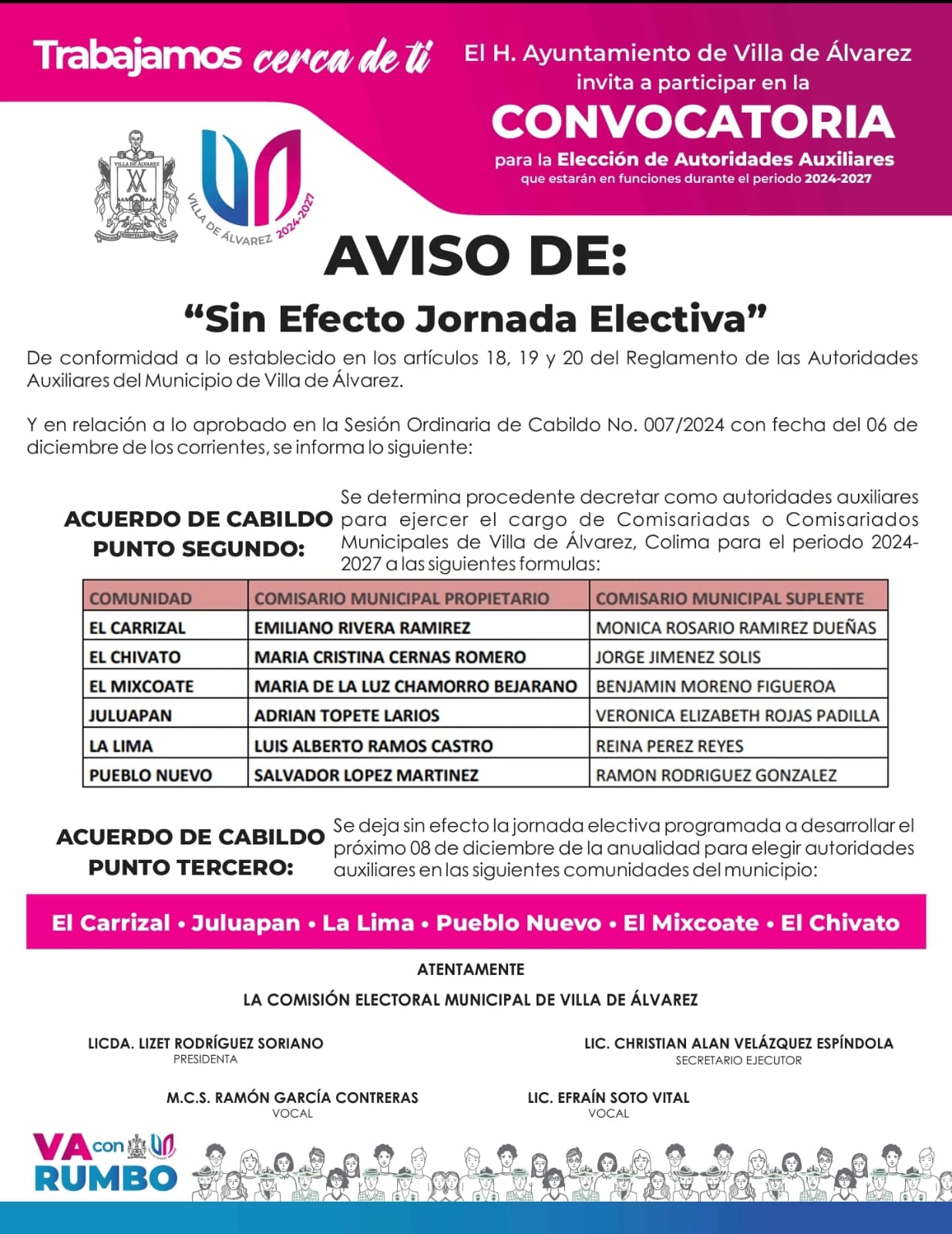 Luego de que en El Carrizal, El Chivato, El Mixcoate, Juluapan, La Lima y Pueblo Nuevo se inscribiera para el proceso electoral sólo una fórmula de candidatos propietario y suplente por cada comunidad, el Cabildo de Villa de Álvarez aprobó dejar sin efecto la jornada electiva en esas localidades.