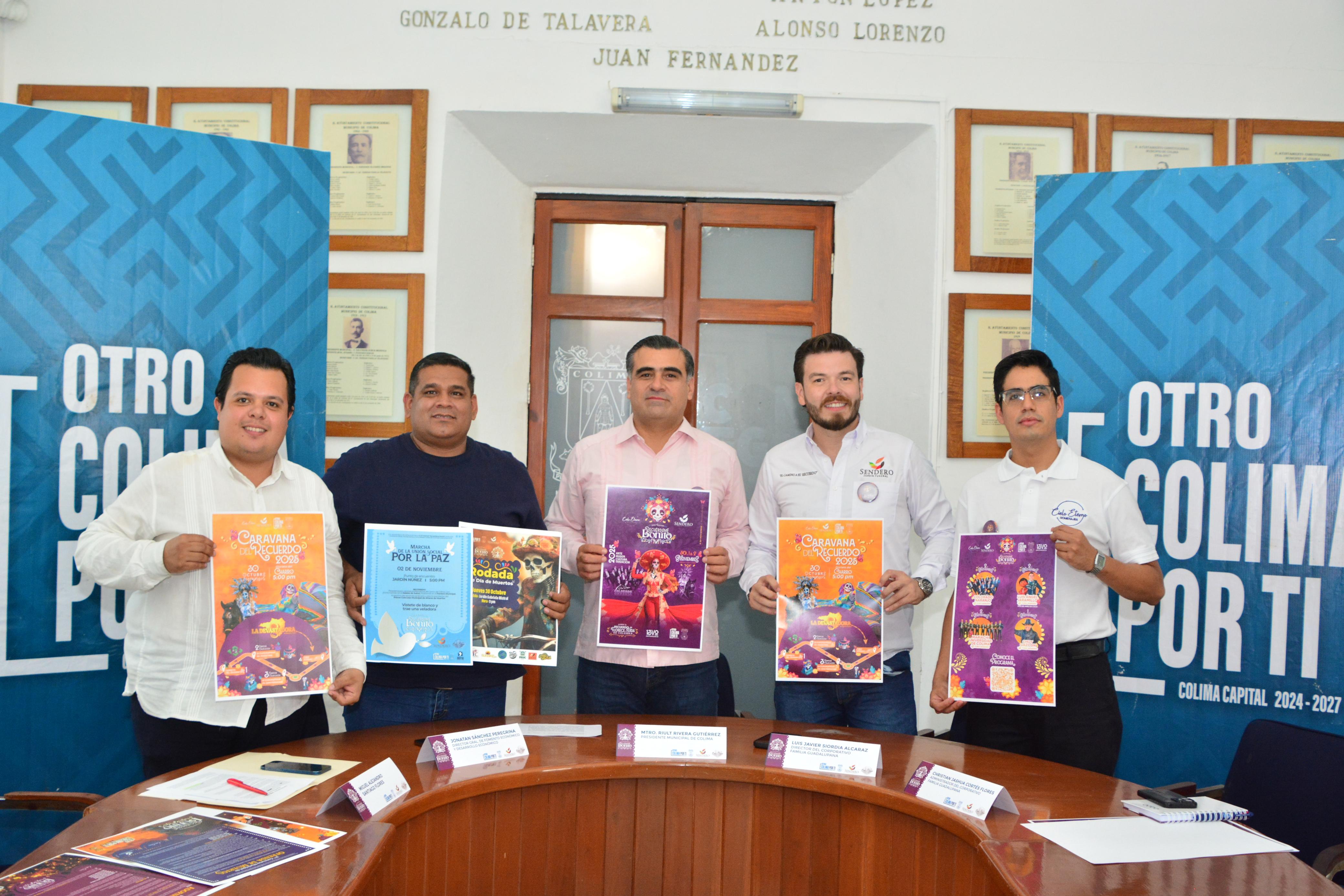 Colima, Col., 30 de octubre de 2025.- El presidente municipal de Colima, Riult Rivera Gutiérrez junto a Javier Siordia Alcaraz dieron a conocer el programa de actividades que con motivo del Día de Muertos se estará desarrollando en diversos escenarios y foros del municipio de Colima, como parte del 13° Festival Recuérdame Bonito el cual se desarrolla de manera coordinada entre el Ayuntamiento de Colima y Sendero Jardín Funeral, del 30 de octubre al 2 de noviembre.