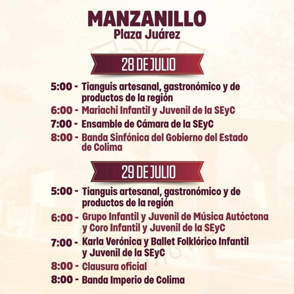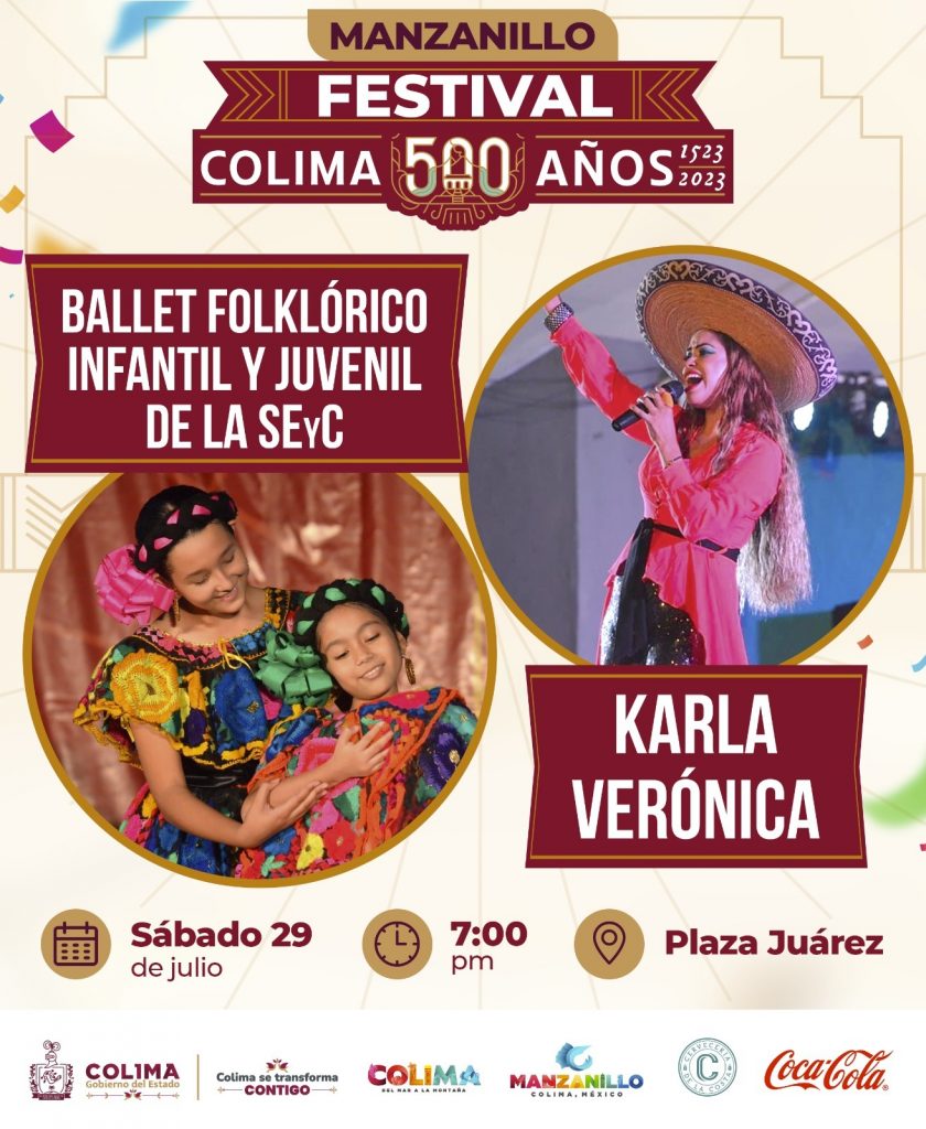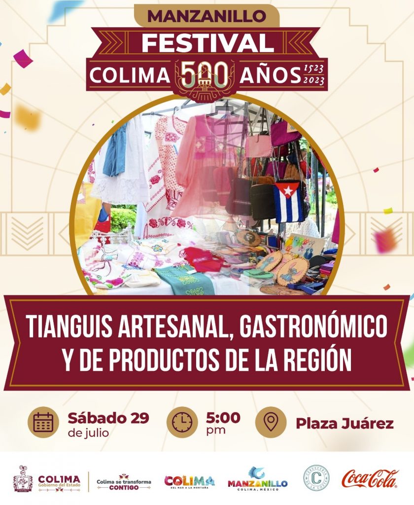 El Gobierno del Estado de Colima invita a la población manzanillense y de toda la entidad, a acudir este sábado 29 de julio al último día de actividades y la clausura del Festival Colima 500 Años, con el que se está celebrando la grandeza, cultura y tradiciones de nuestra entidad a través de diversos eventos artísticos y el tianguis artesanal, gastronómico y de productos de la región.