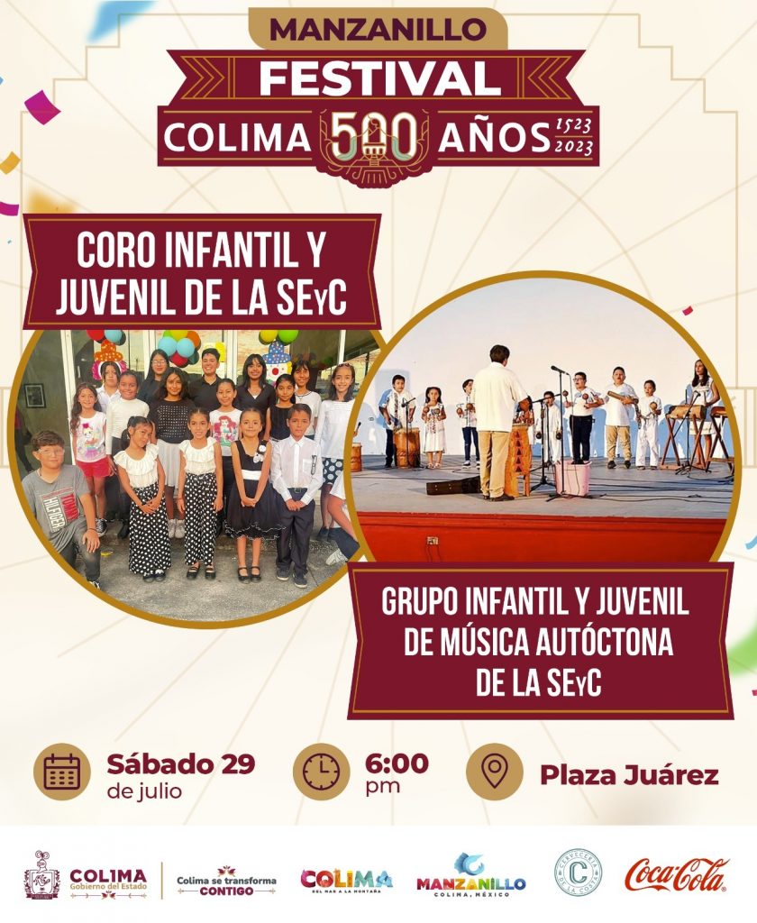Este sábado se llevará a cabo la clausura de este gran festival estatal de la conmemoración de los 500 años de la fundación de la primera Villa de Colima, que inició en la ciudad capital el miércoles 26 de julio y se trasladó al municipio de Manzanillo desde este viernes, donde, dentro de la Plaza Juárez en el centro histórico, se han presentado varias agrupaciones artísticas que representan al talento local.