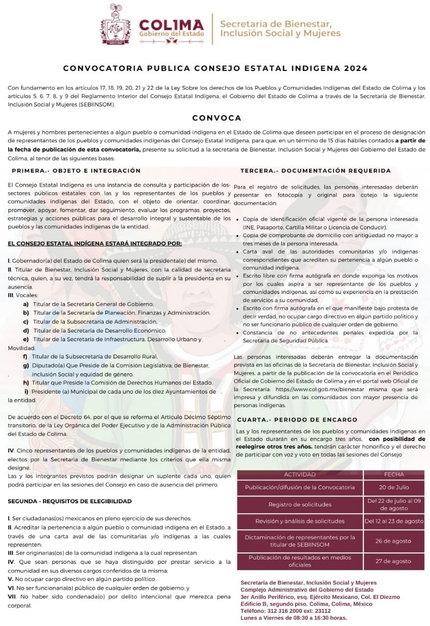 En la convocatoria anexa están los pormenores, para quienes desean integrarse al Consejo Estatal Indígena. https://periodicooficial.col.gob.mx/p/20072024/p24072001.pdf (página 28)