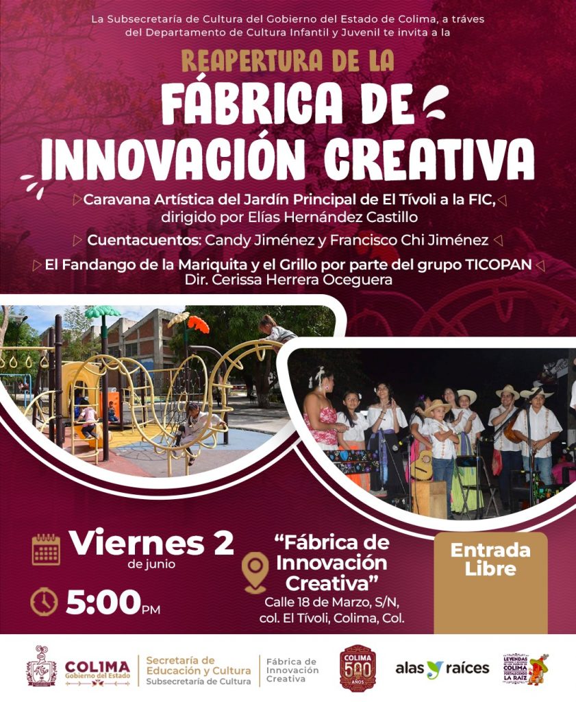 La Subsecretaría de Cultura del Gobierno del Estado de Colima, a través del Departamento de Cultura Infantil y Juvenil, invita a las familias colimenses a la reapertura de la Fábrica de Innovación Creativa en la colonia El Tívoli del municipio capitalino, que se llevará a cabo este viernes 2 de junio, a partir de las 5 de la tarde.