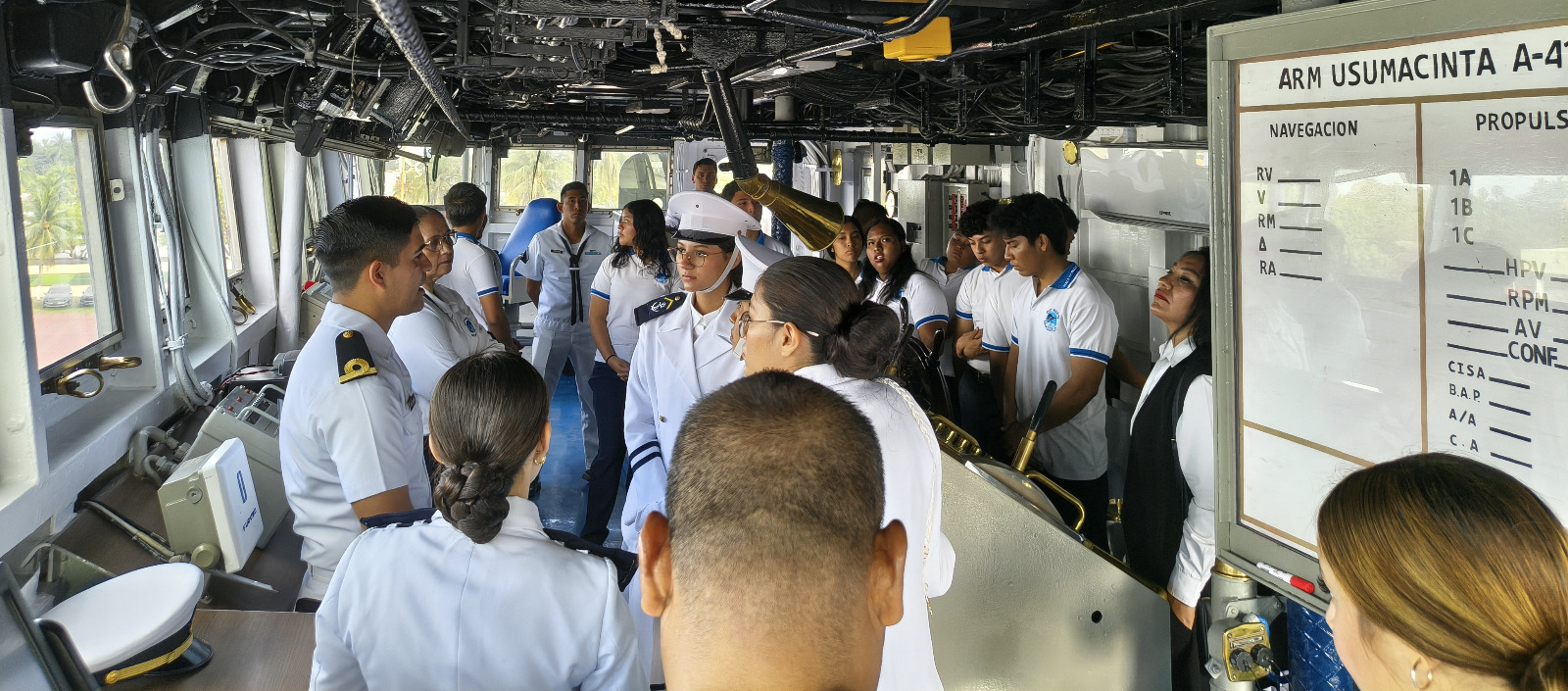 Posteriormente, realizaron un recorrido a bordo del Buque ARM Usumacinta, donde conocieron diversas áreas operativas de la unidad, entre ellas la cubierta de vuelo, en la que se les explicó la maniobra para la recepción de helicópteros, la rampa de proa utilizada para el embarque de vehículos; así como el puente de mando, donde pudieron observar aspectos relacionados con la navegación y conducción del buque, incluyendo una explicación sobre navegación astronómica.