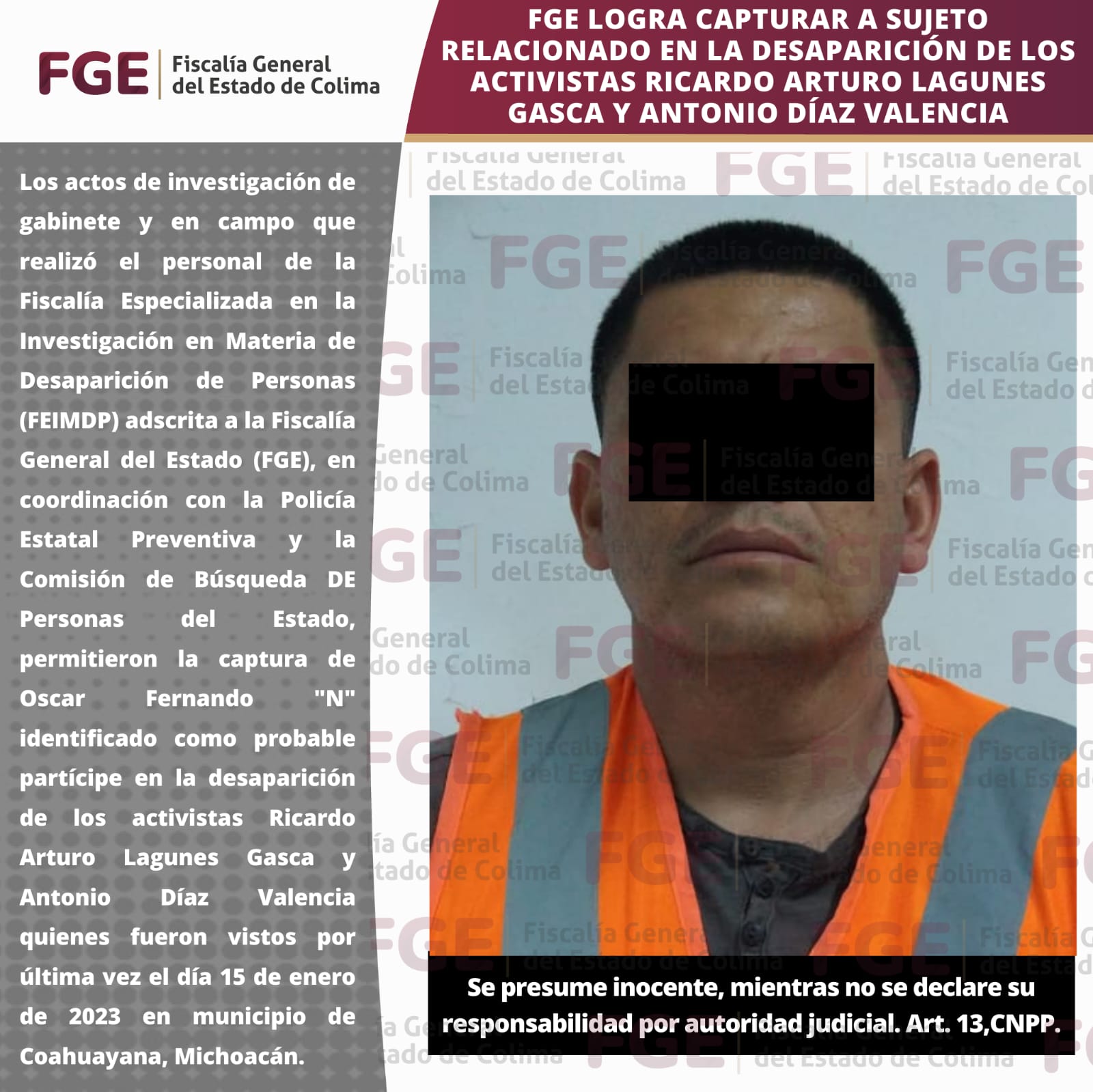 Los actos de investigación de gabinete y en campo que realizó el personal de la Fiscalía Especializada en la Investigación en Materia de Desaparición de Personas (FEIMDP) adscrita a la Fiscalía General del Estado (FGE), en coordinación con la Policía Estatal Preventiva y la Comisión de Búsqueda de Personas del Estado, permitieron la captura de Oscar Fernando «N» identificado como probable partícipe en la desaparición de los activistas Ricardo Arturo Lagunes Gasca y Antonio Díaz Valencia, quienes fueron vistos por última vez el día 15 de enero de 2023 en municipio de Coahuayana, Michoacán.