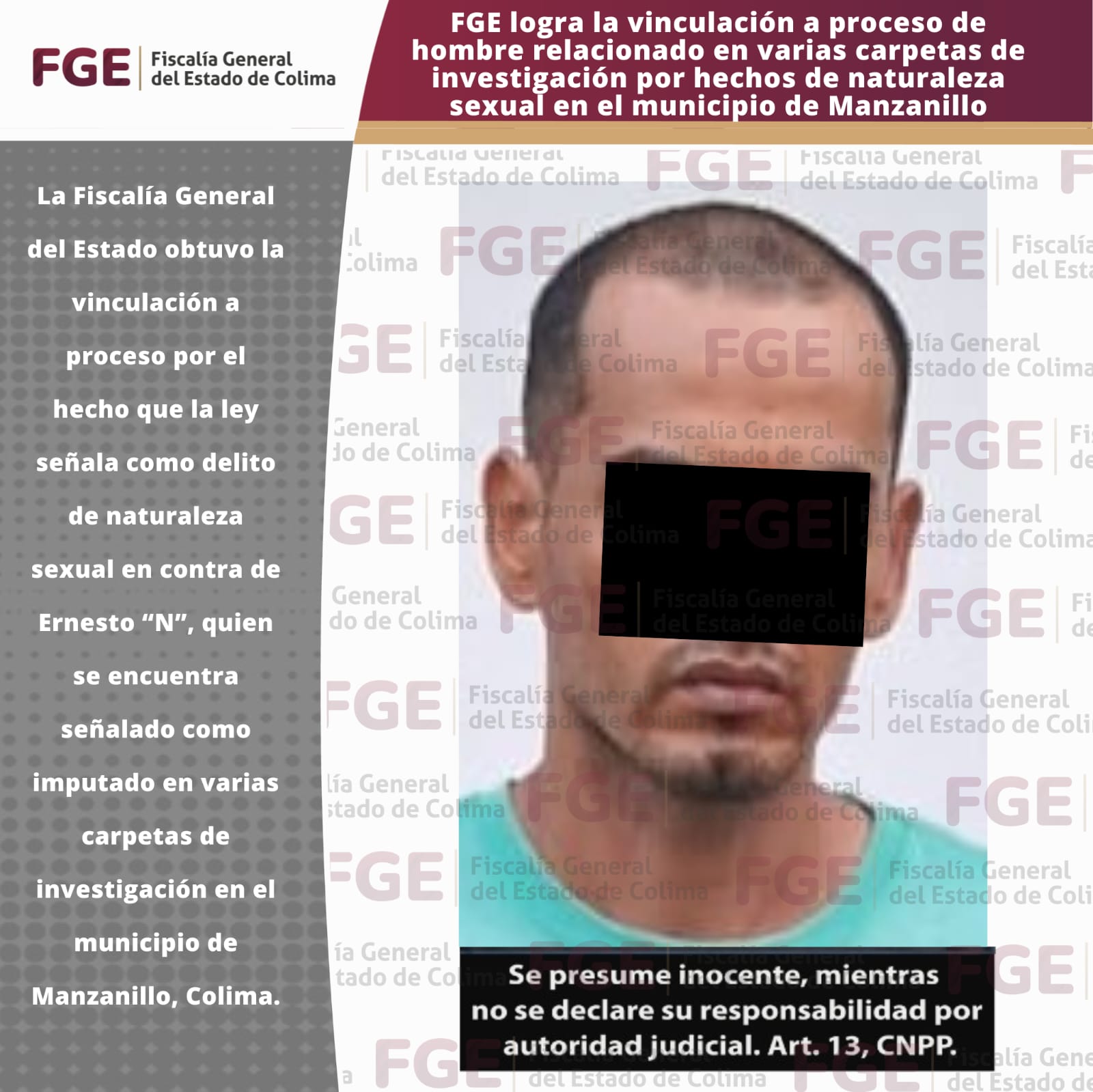 La Fiscalía General del Estado obtuvo la vinculación a proceso por el hecho que la ley señala como delito de naturaleza sexual en contra de Ernesto “N”, quien se encuentra señalado como imputado en varias carpetas de investigación en el municipio de Manzanillo, Colima.