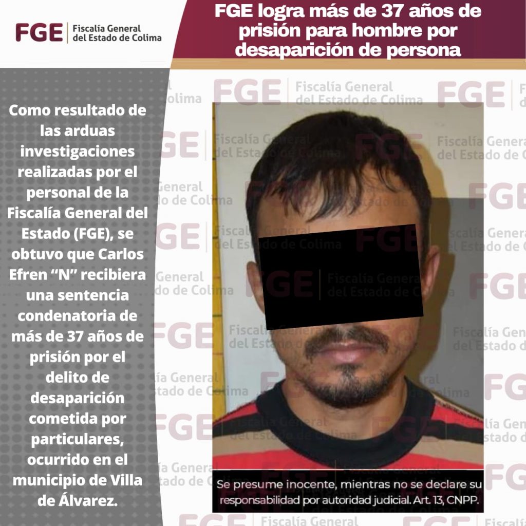 Como resultado de las arduas investigaciones realizadas por el personal de la Fiscalía General del Estado (FGE), se obtuvo que Carlos Efren “N” recibiera una sentencia condenatoria de más de 37 años de prisión por el delito de desaparición cometida por particulares, ocurrido en el municipio de Villa de Álvarez.