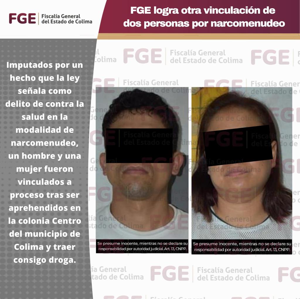 Imputados por un hecho que la ley señala como delito de contra la salud en la modalidad de narcomenudeo, un hombre y una mujer fueron vinculados a proceso tras ser aprehendidos en la colonia Centro del municipio de Colima y traer consigo droga.