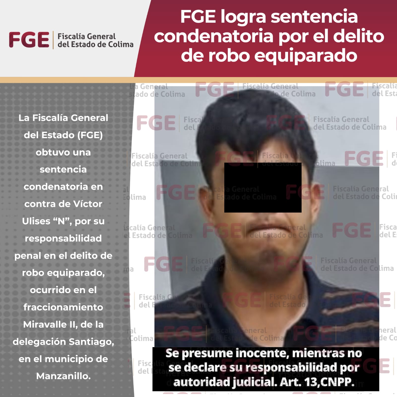 La Fiscalía General del Estado (FGE) obtuvo una sentencia condenatoria en contra de Víctor Ulises “N”, por su responsabilidad penal en el delito de robo equiparado, ocurrido en el fraccionamiento Miravalle II, de la delegación Santiago, en el municipio de Manzanillo.