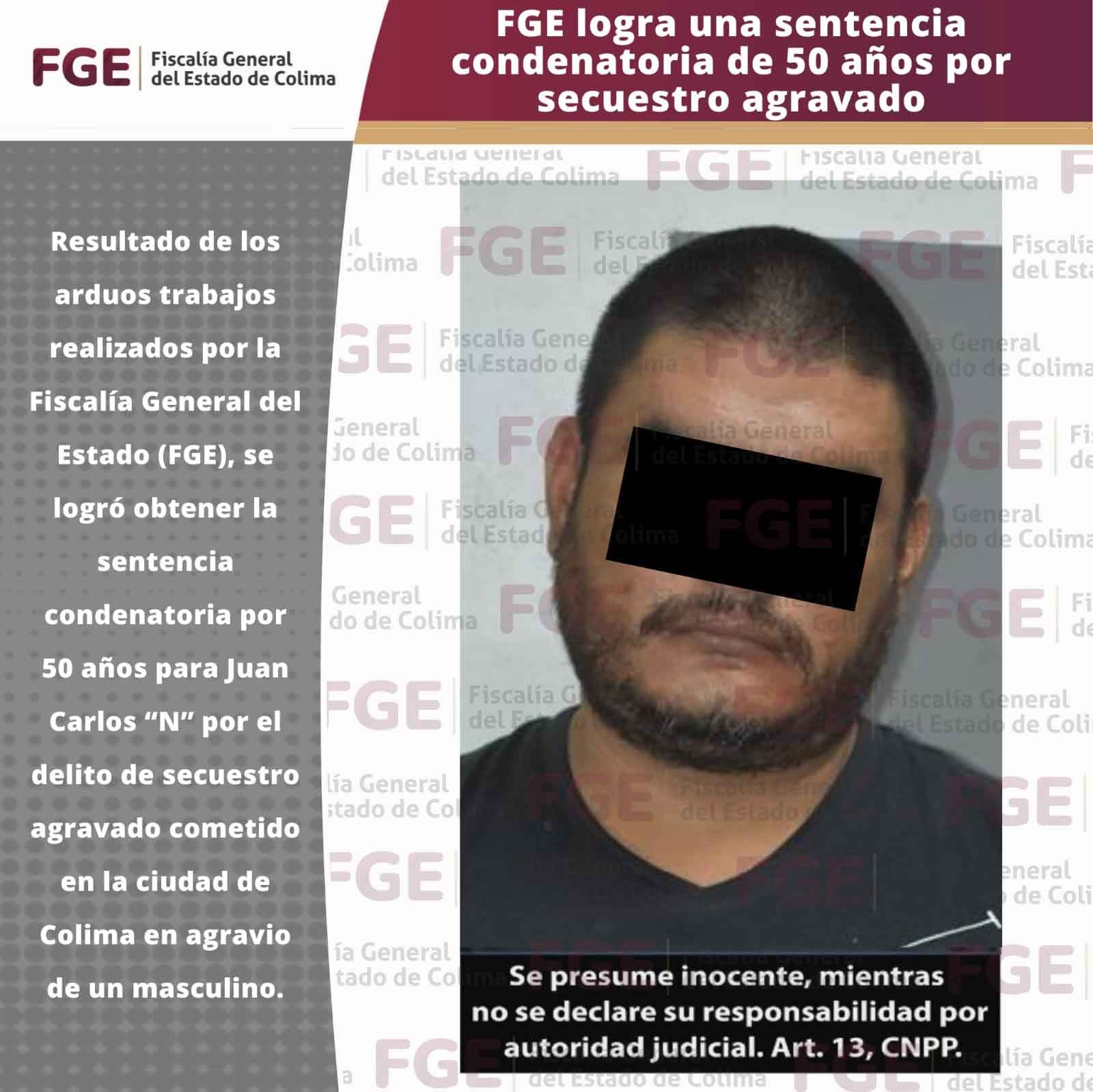 Resultado de los arduos trabajos realizados por la Fiscalía General del Estado (FGE), se logró obtener la sentencia condenatoria por 50 años para Juan Carlos “N” por el delito de secuestro agravado cometido en la ciudad de Colima en agravio de un masculino.
