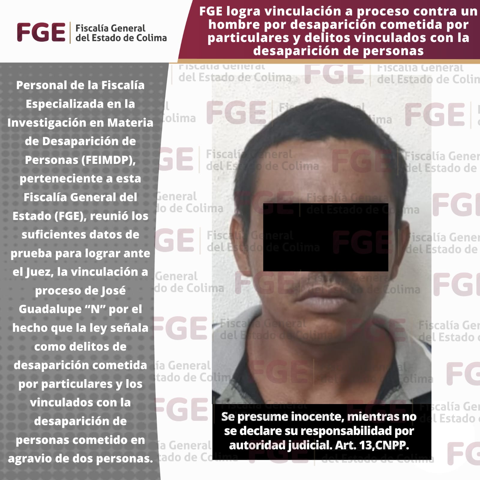 Personal de la Fiscalía Especializada en la Investigación en Materia de Desaparición de Personas (FEIMDP), perteneciente a esta Fiscalía General del Estado (FGE), reunió los suficientes datos de prueba para lograr ante el Juez, la vinculación a proceso de José Guadalupe “N” por el hecho que la ley señala como delitos de desaparición cometida por particulares y los vinculados con la desaparición de personas cometido en agravio de dos personas.