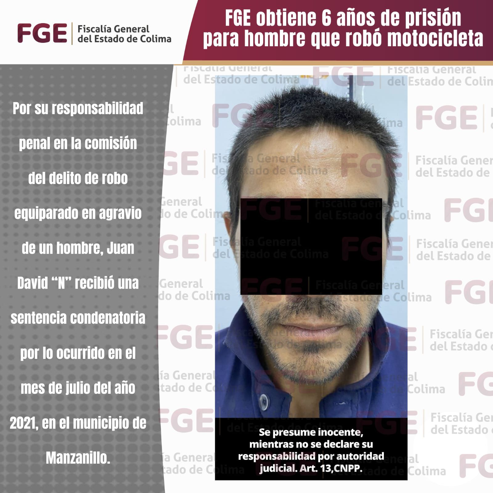 Por su responsabilidad penal en la comisión del delito de robo equiparado en agravio de un hombre, Juan David “N” recibió una sentencia condenatoria por lo ocurrido en el mes de julio del año 2021, en el municipio de Manzanillo.