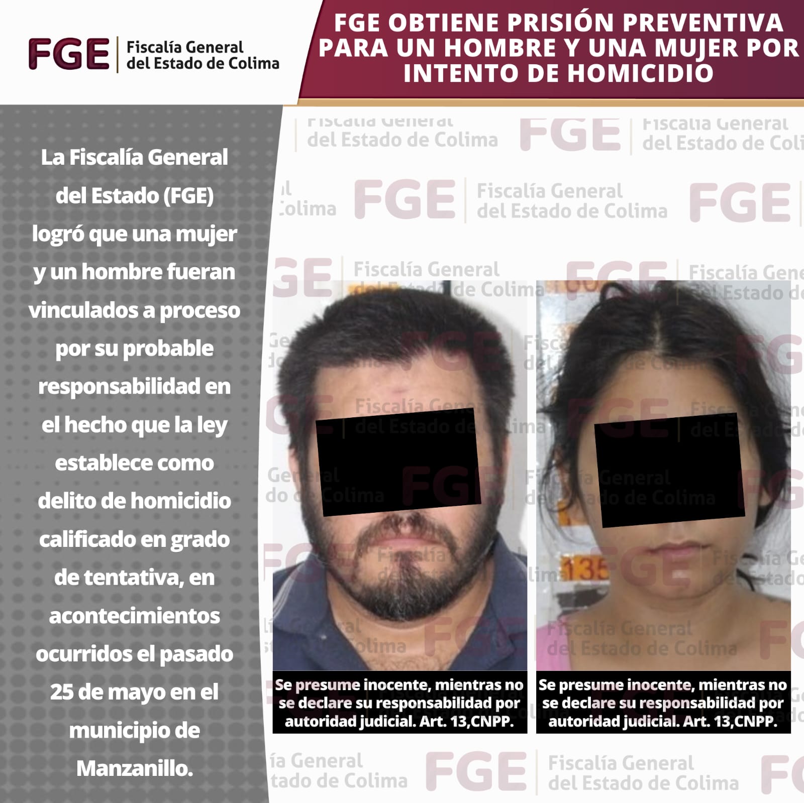 La Fiscalía General del Estado (FGE) logró que una mujer y un hombre fueran vinculados a proceso por su probable responsabilidad en el hecho que la ley establece como delito de homicidio calificado en grado de tentativa, en acontecimientos ocurridos el pasado 25 de mayo en el municipio de Manzanillo.