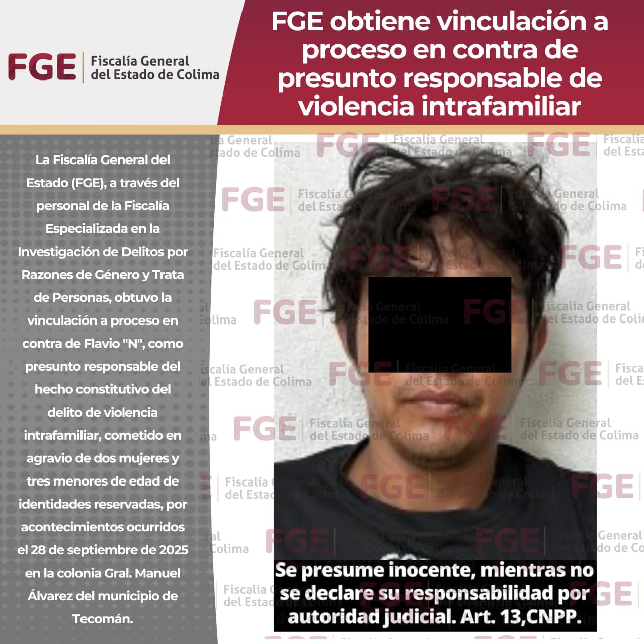 La Fiscalía General del Estado (FGE), a través del personal de la Fiscalía Especializada en la Investigación de Delitos por Razones de Género y Trata de Personas, obtuvo la vinculación a proceso en contra de Flavio «N», como presunto responsable del hecho constitutivo del delito de violencia intrafamiliar, cometido en agravio de dos mujeres y tres menores de edad de identidades reservadas, por acontecimientos ocurridos el 28 de septiembre de 2025 en la colonia Gral. Manuel Álvarez del municipio de Tecomán.