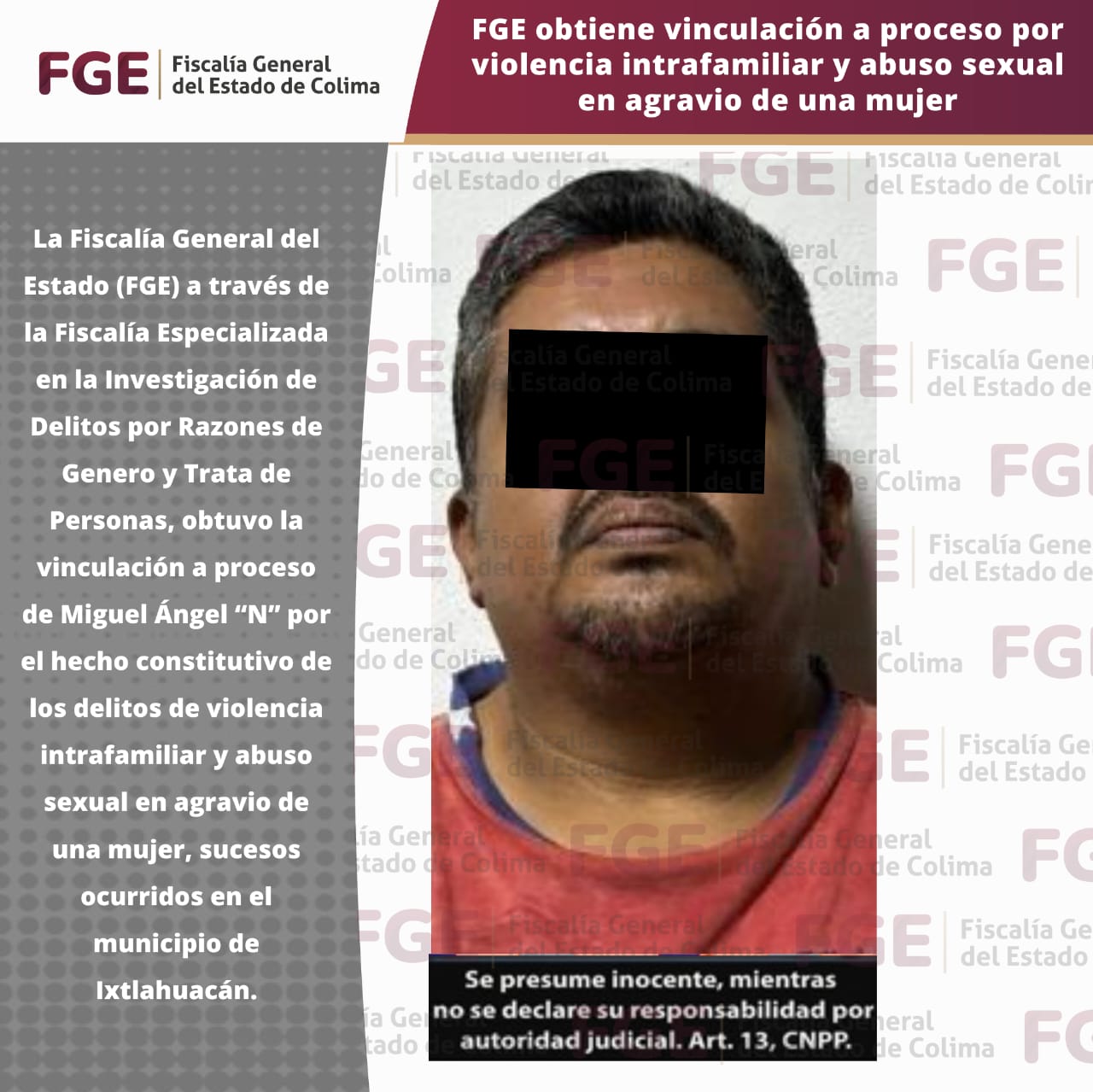 La Fiscalía General del Estado (FGE) a través de la Fiscalía Especializada en la Investigación de Delitos por Razones de Genero y Trata de Personas, obtuvo la vinculación a proceso de Miguel Ángel “N” por el hecho constitutivo de los delitos de violencia intrafamiliar y abuso sexual en agravio de una mujer, sucesos ocurridos en el municipio de Ixtlahuacán.
