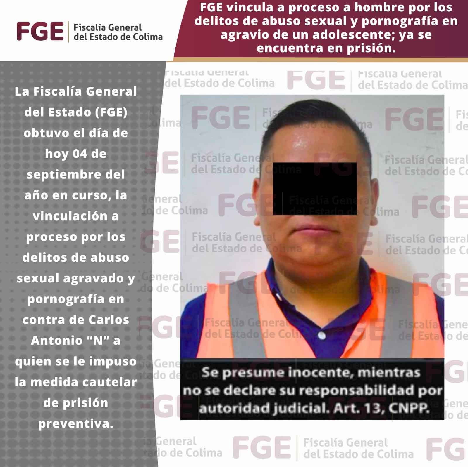 La Fiscalía General del Estado (FGE) obtuvo el día de hoy 04 de septiembre del año en curso, la vinculación a proceso por los delitos de abuso sexual agravado y pornografía en contra de Carlos Antonio “N” a quien se le impuso la medida cautelar de prisión preventiva.