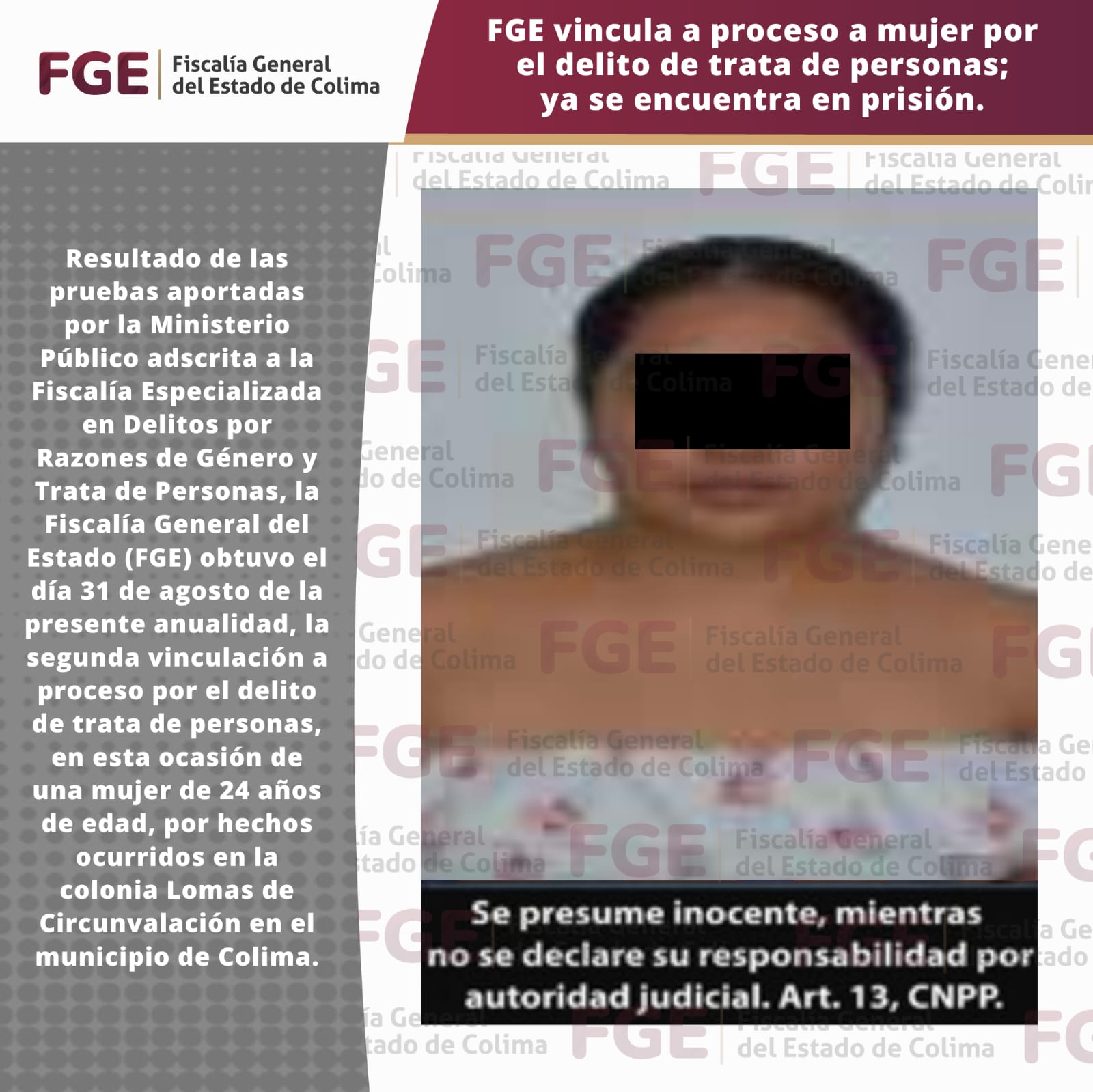 Resultado de las pruebas aportadas por la Ministerio Público adscrita a la Fiscalía Especializada en Delitos por Razones de Género y Trata de Personas, la Fiscalía General del Estado (FGE) obtuvo el día 31 de agosto de la presente anualidad, la segunda vinculación a proceso por el delito de trata de personas, en esta ocasión de una mujer de 24 años de edad, por hechos ocurridos en la colonia Lomas de Circunvalación en el municipio de Colima.
