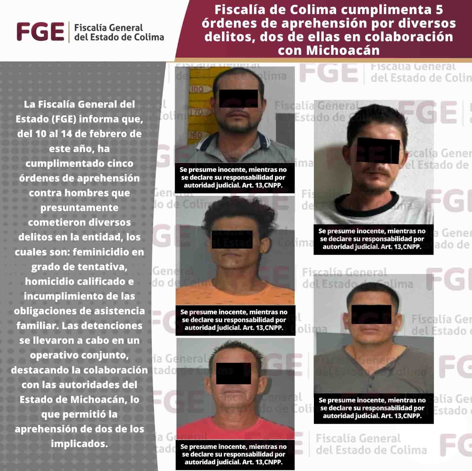 Fiscalía de Colima cumplimenta 5 órdenes de aprehensión por diversos delitos, dos de ellas en colaboración con Michoacán