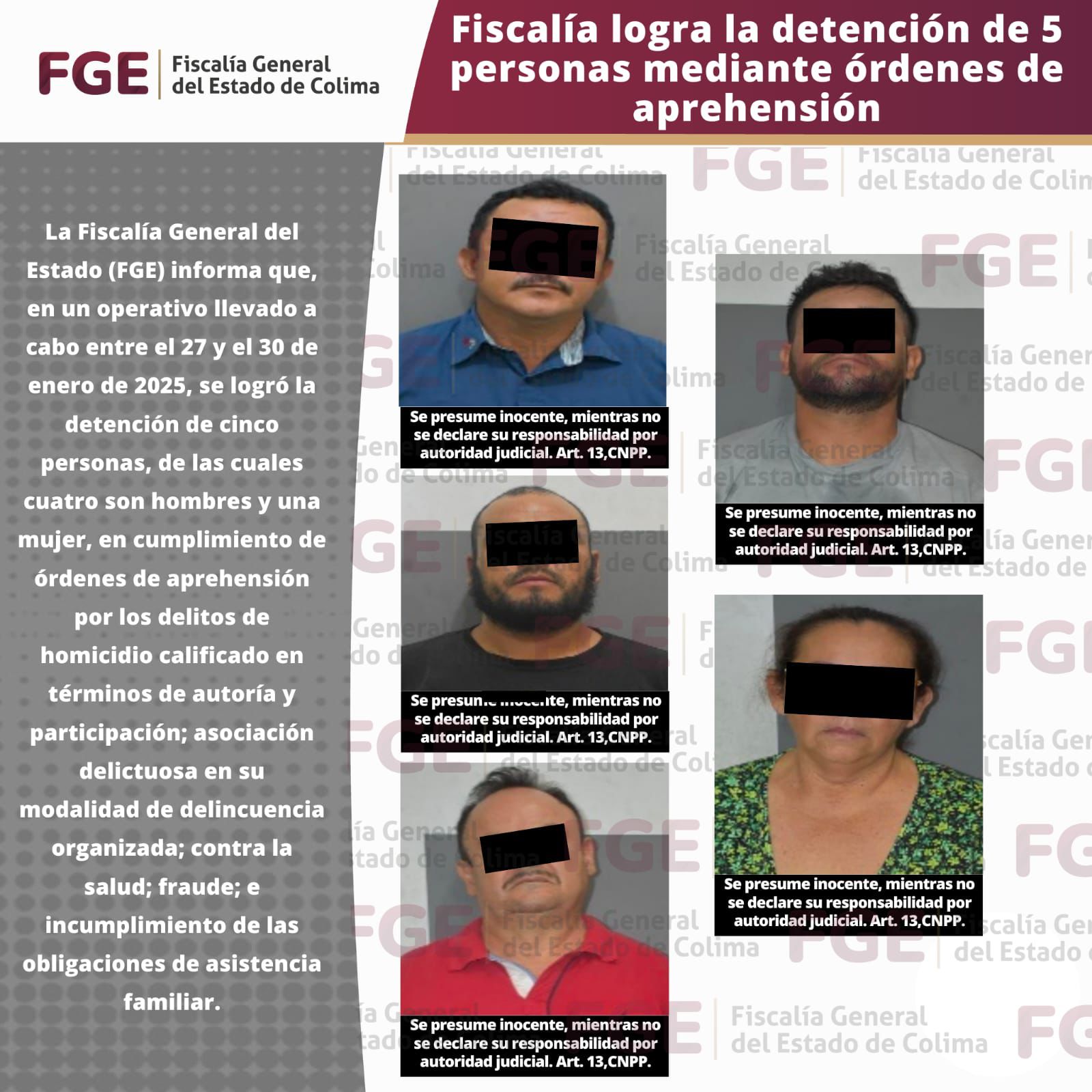 La Fiscalía General del Estado (FGE) informa que, en un operativo llevado a cabo entre el 27 y el 30 de enero de 2025, se logró la detención de cinco personas, de las cuales cuatro son hombres y una mujer, en cumplimiento de órdenes de aprehensión por los delitos de homicidio calificado en términos de autoría y participación; asociación delictuosa en su modalidad de delincuencia organizada; contra la salud; fraude; e incumplimiento de las obligaciones de asistencia familiar.