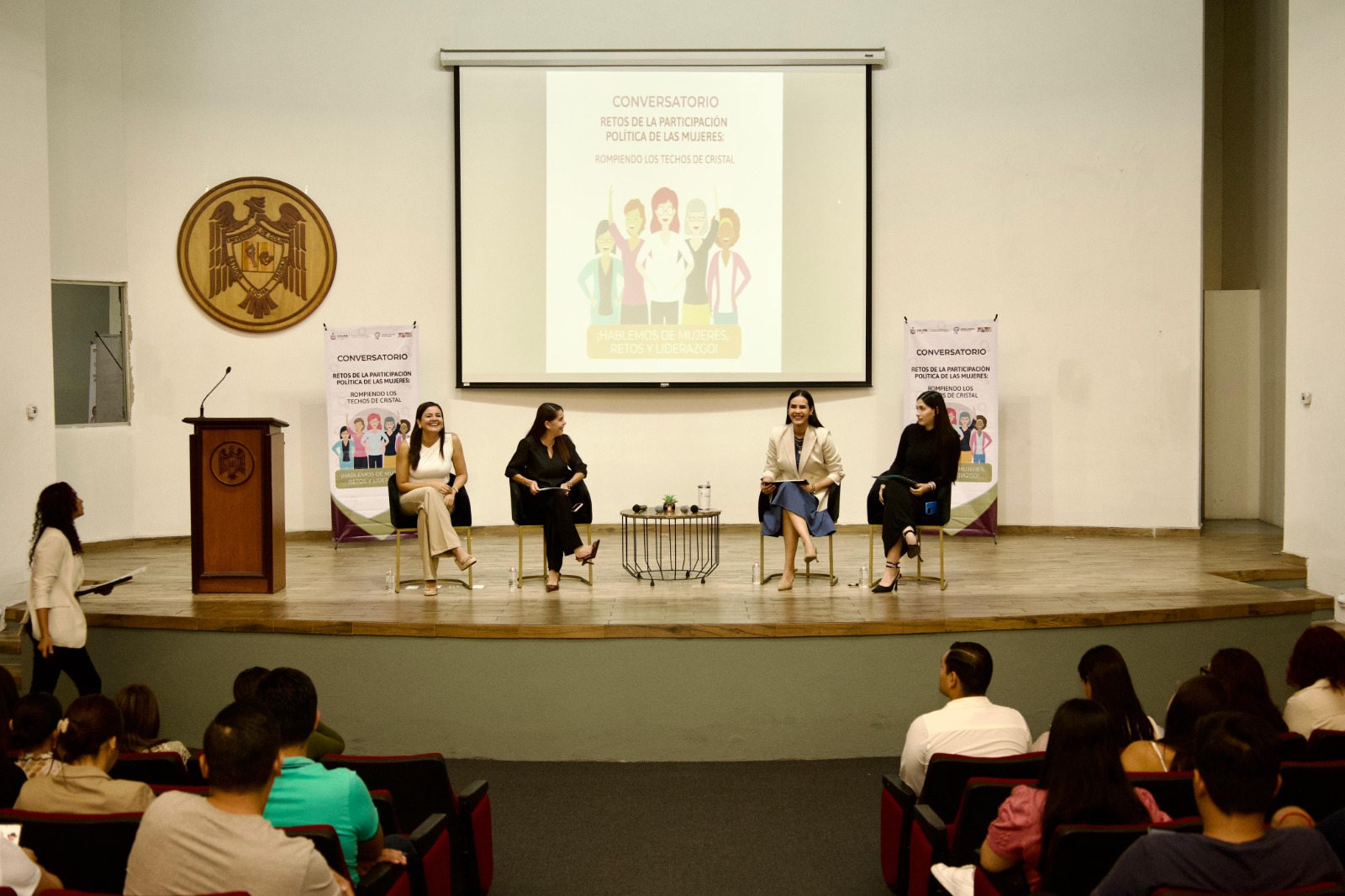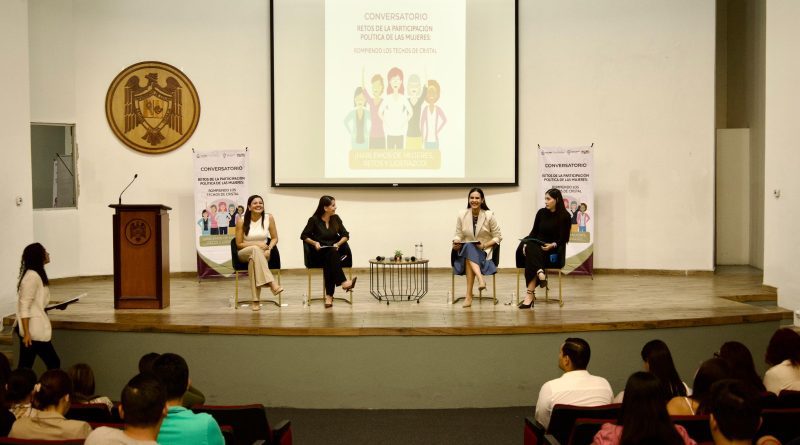 Durante el conversatorio ‘Rompiendo los techos de cristal’ en la Facultad de Ciencias Políticas y Sociales de la Universidad de Colima, participaron estudiantes, académicas de la máxima casa de estudios y servidoras públicas de la administración estatal que preside la gobernadora Indira Vizcaíno Silva, quienes compartieron experiencias sobre los retos que enfrentan las mujeres en el ámbito público.