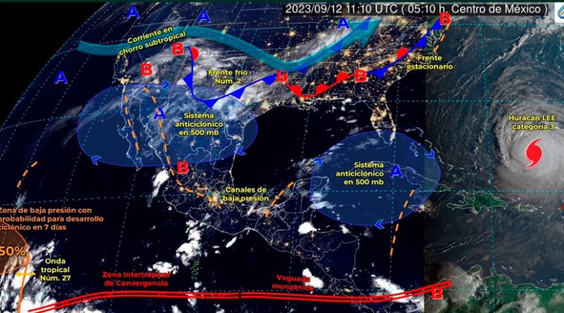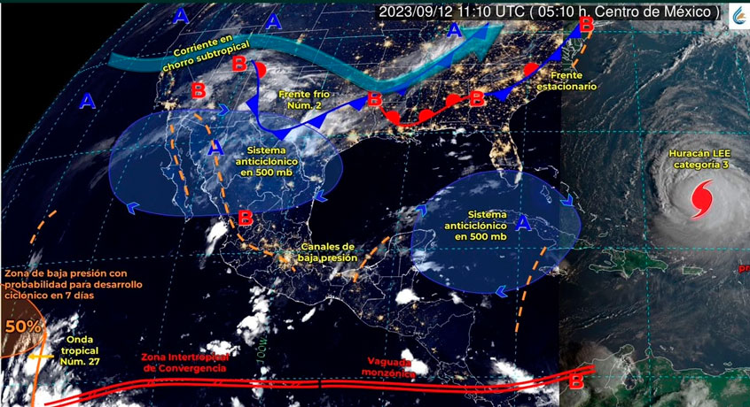 Hoy martes 12 de septiembre, el nuevo frente frío número 2 sobre el territorio nacional producirá precipitaciones pluviales muy fuertes en diversas entidades de la República Mexicana, así como lluvias y chubascos en el noroeste, norte, noreste, occidente, centro y sur del país, incluido el estado de Colima.