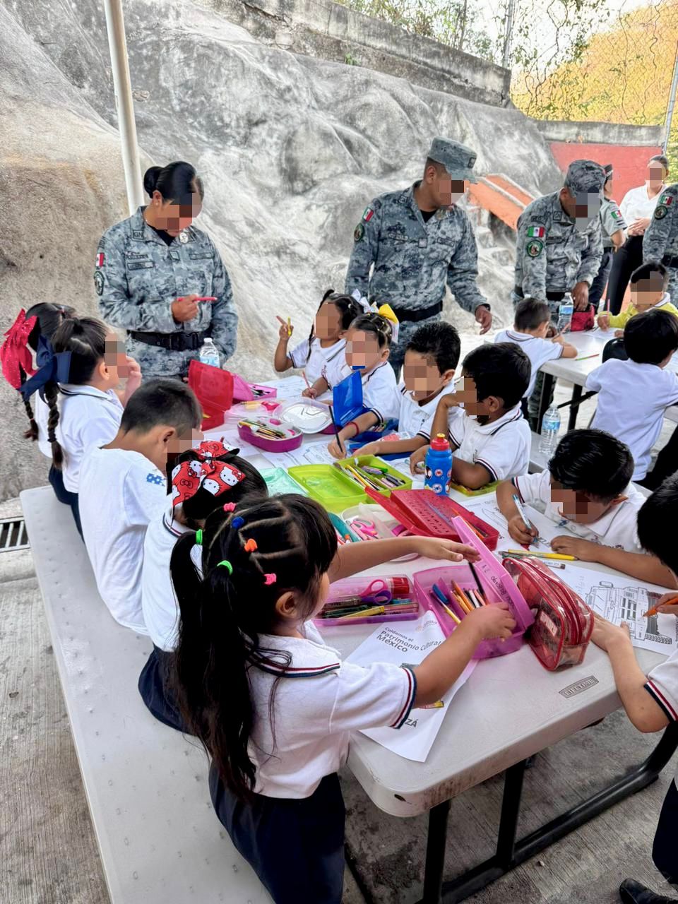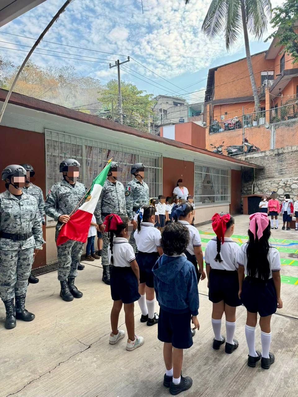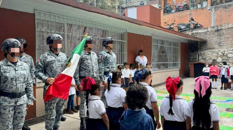 Entre banderas y una entusiasta participación estudiantil, la Guardia Nacional realizó este lunes una jornada más de acercamiento social en planteles educativos del estado de Colima, visitando las primarias “Adolfo López Mateos” y “Revolución” en Armería y el jardín de niños “Beatriz Cortés” en Manzanillo.