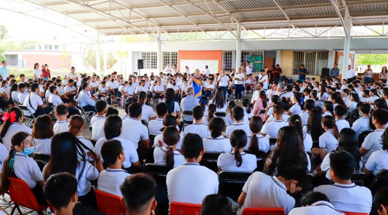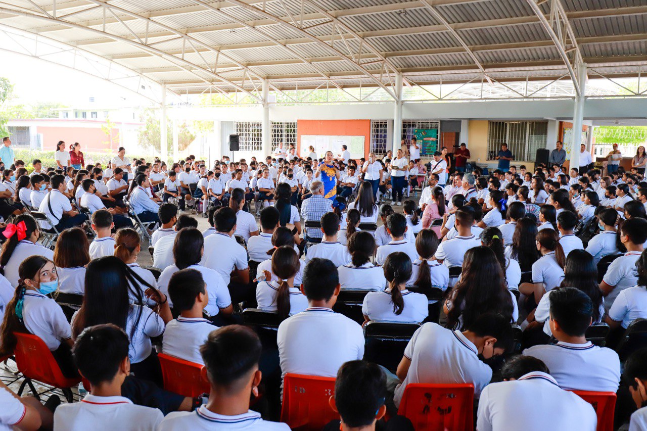 Gobernadora conversa con estudiantes de Tecomán; les motiva a luchar por sus metas