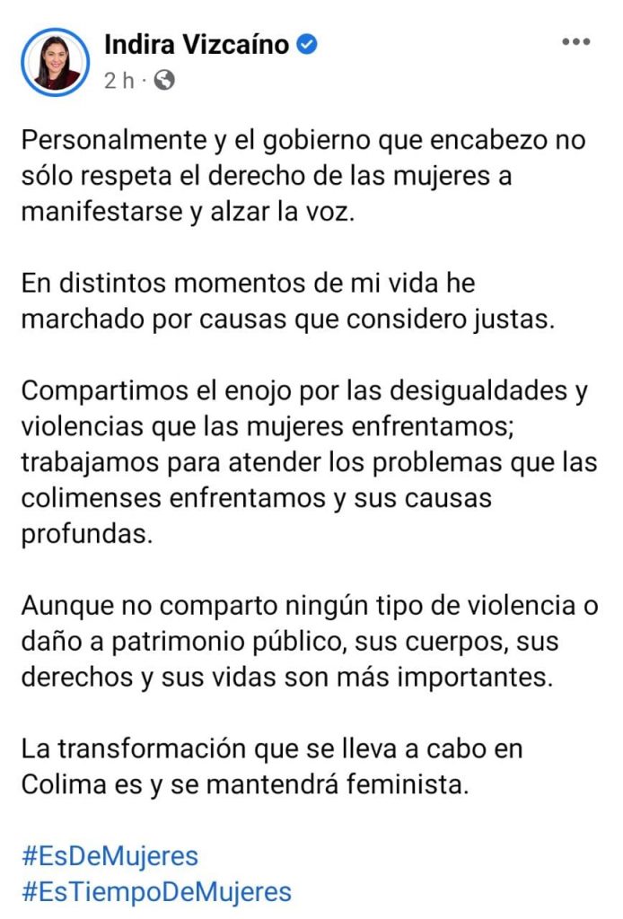 General Gobernadora de Colima Indira Vizcaíno, fija postura por manifestaciones #8M EnredColima marzo 8, 2023marzo 8, 2023
