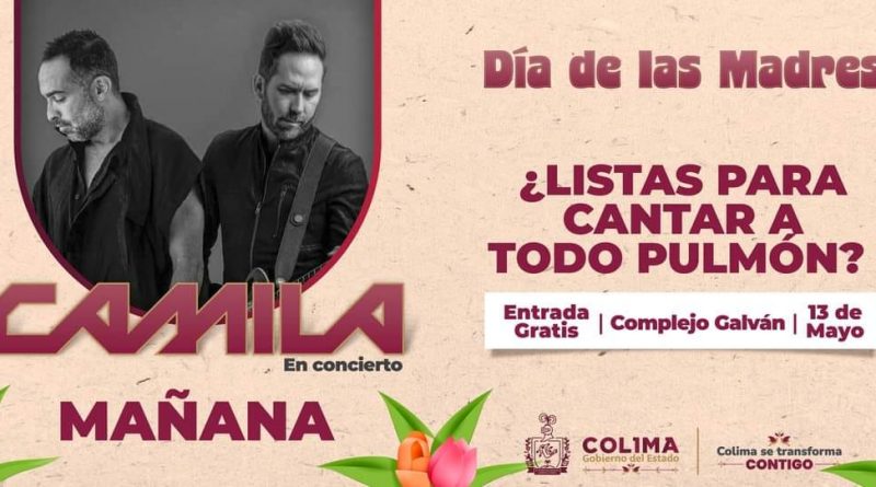 Todo se encuentra prácticamente listo para el concierto gratuito del grupo Camila, con el que el Gobierno del Estado de Colima celebrará a todas las madres por su reciente día social, este sábado 13 de mayo a partir de las 6 de la tarde en el Complejo Galván (la antigua zona militar), que se ubica por la calzada Pedro A. Galván, frente a la Casa de la Cultura de Colima.