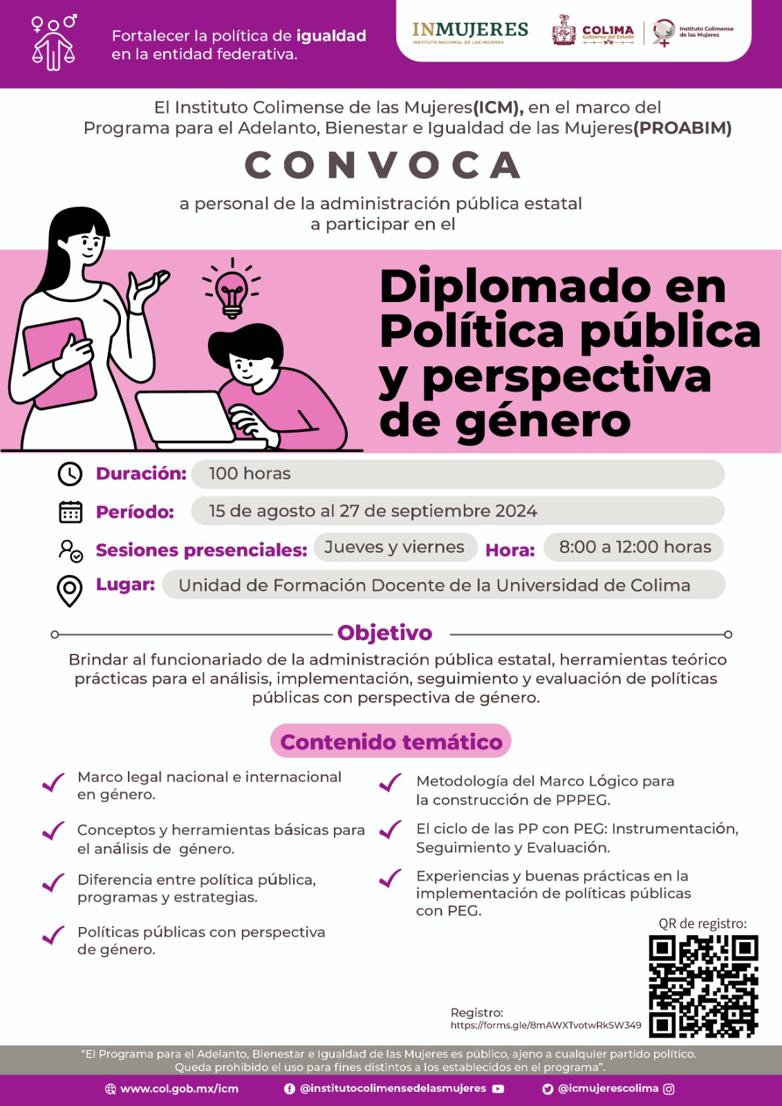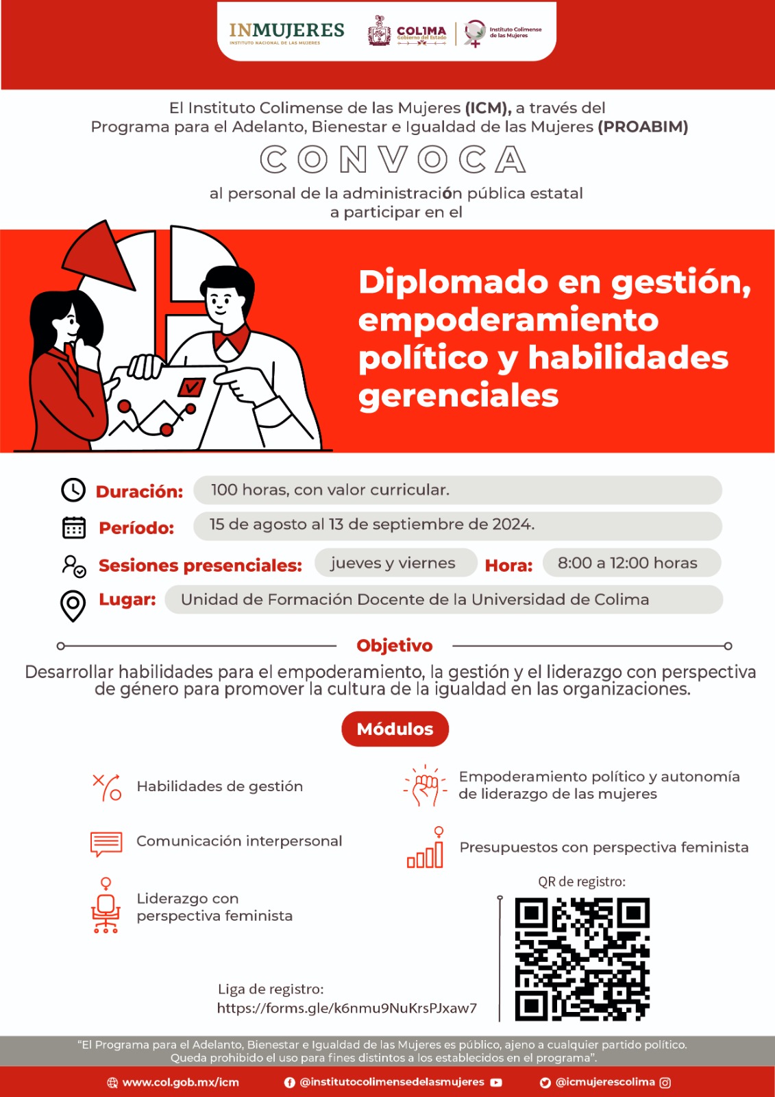 El Gobierno del Estado de Colima, a través del Instituto Colimense de las Mujeres (ICM), invita a quienes integran las Unidades para la Igualdad de Género (UIG) en la administración pública estatal, así como a servidoras y servidores públicos, a inscribirse a los Diplomados en Política Pública y Perspectiva de Género y Gestión, Empoderamiento Político y Habilidades Gerenciales, que se impartirán gratuitamente en instalaciones de la Universidad de Colima.