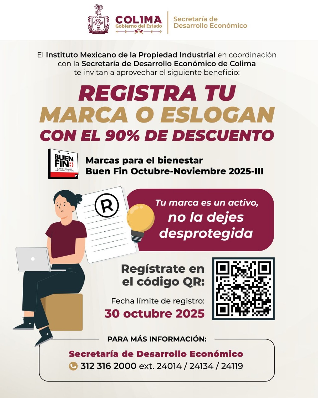 El Gobierno del Estado de Colima, a través de la Secretaría de Desarrollo Económico (Sedeco), en coordinación con el Instituto Mexicano de la Propiedad Industrial (IMPI), invita a emprendedoras, emprendedores, así como empresarias y empresarios colimenses, a proteger su identidad comercial mediante el registro de su marca o eslogan con un 90% de descuento, como parte de la campaña ‘Marcas para el Bienestar – Buen Fin 2025-III’.