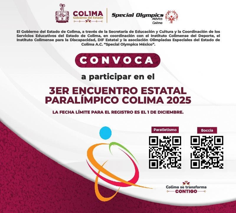 El Gobierno del Estado de Colima que encabeza la mandataria Indira Vizcaíno Silva, a través de la Secretaría de Educación y Cultura, el Instituto Colimense del Deporte (Incode), Instituto Colimense de la Discapacidad (Incodis), DIF Estatal Colima y la Asociación de Olimpiadas Especiales, invita a participar en el Encuentro Estatal Paralímpico en el marco del Día Internacional de Personas con Discapacidad, que se efectuará el viernes 5 de diciembre a partir de las 8:00 de la mañana, en la pista de la unidad deportiva ‘José María Morelos y Pavón’.