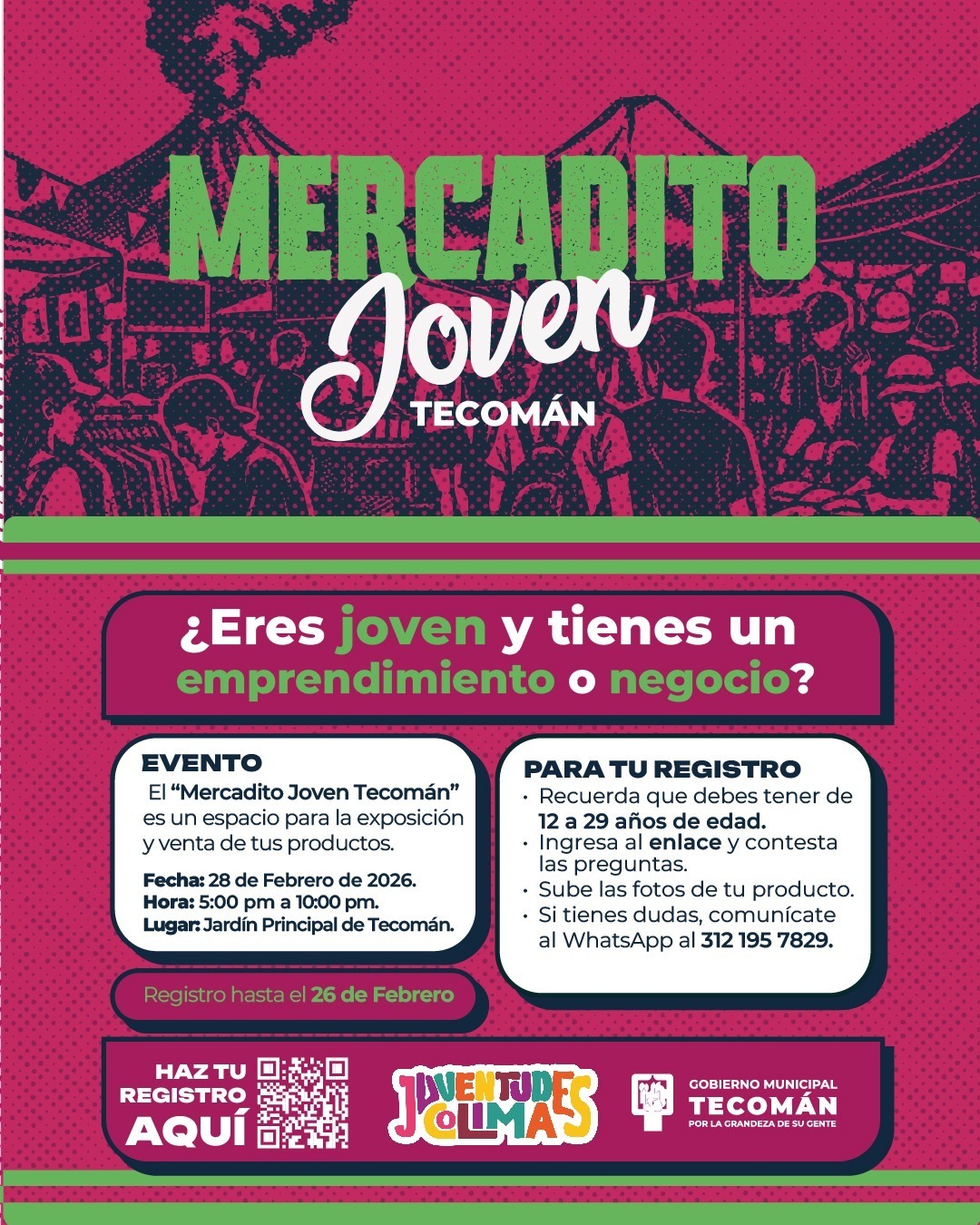 La convocatoria para tener un espacio gratuito donde exhibir y vender productos está disponible en las redes oficiales de Juventudes Colima y las personas seleccionadas serán notificadas con antelación a través del correo electrónico que registren; es importante mencionar que para esta segunda edición del Mercadito Joven Tecomán 2026, hay cupo limitado a sesenta personas.