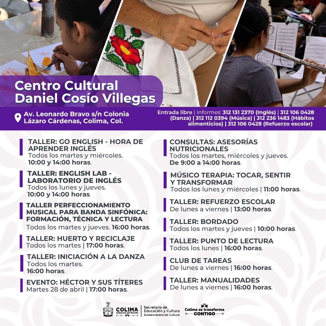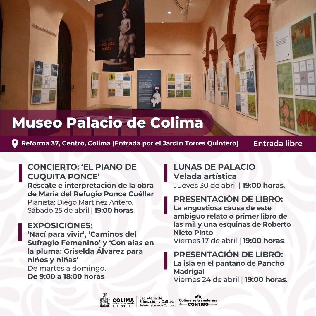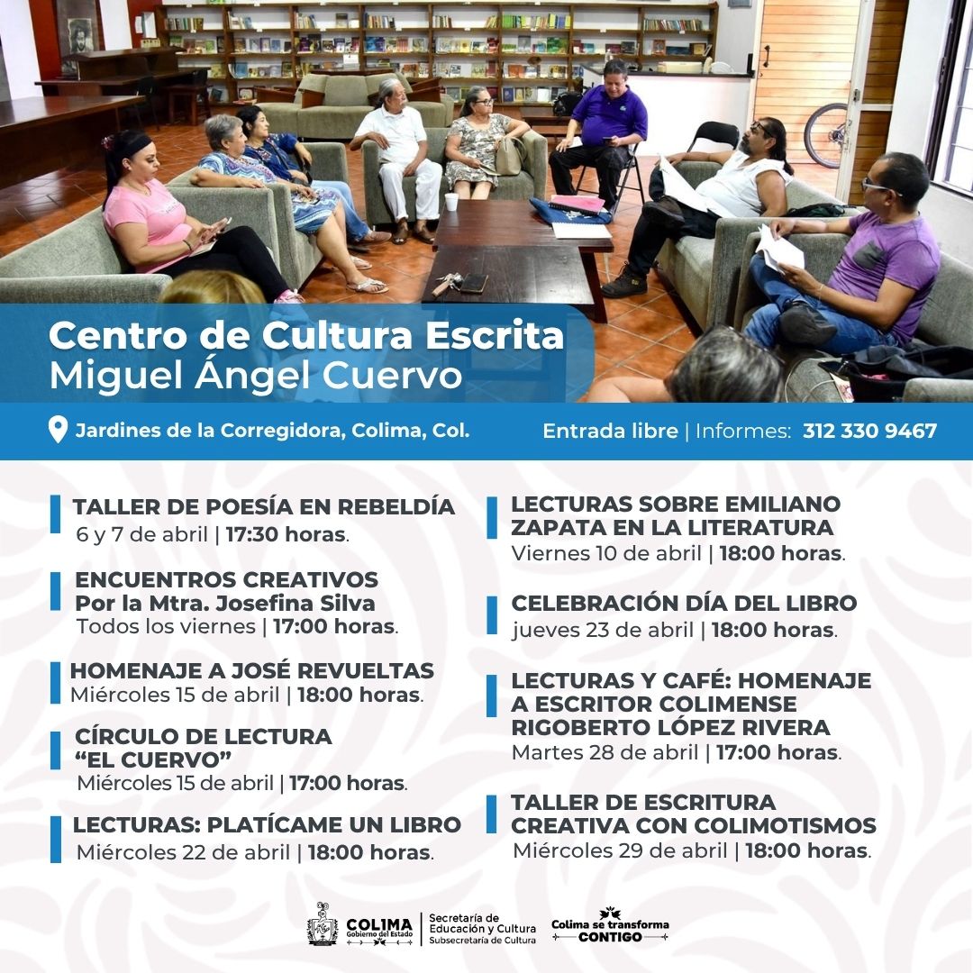 La Subsecretaría de Cultura del Gobierno del Estado de Colima comparte la agenda de abril con más de 70 actividades artístico-culturales, talleres gratuitos, clases magistrales, funciones de teatro, presentaciones dancísticas, conciertos y eventos literarios para todo público, que tendrán lugar en los trece centros y recintos culturales que administra esta dependencia.