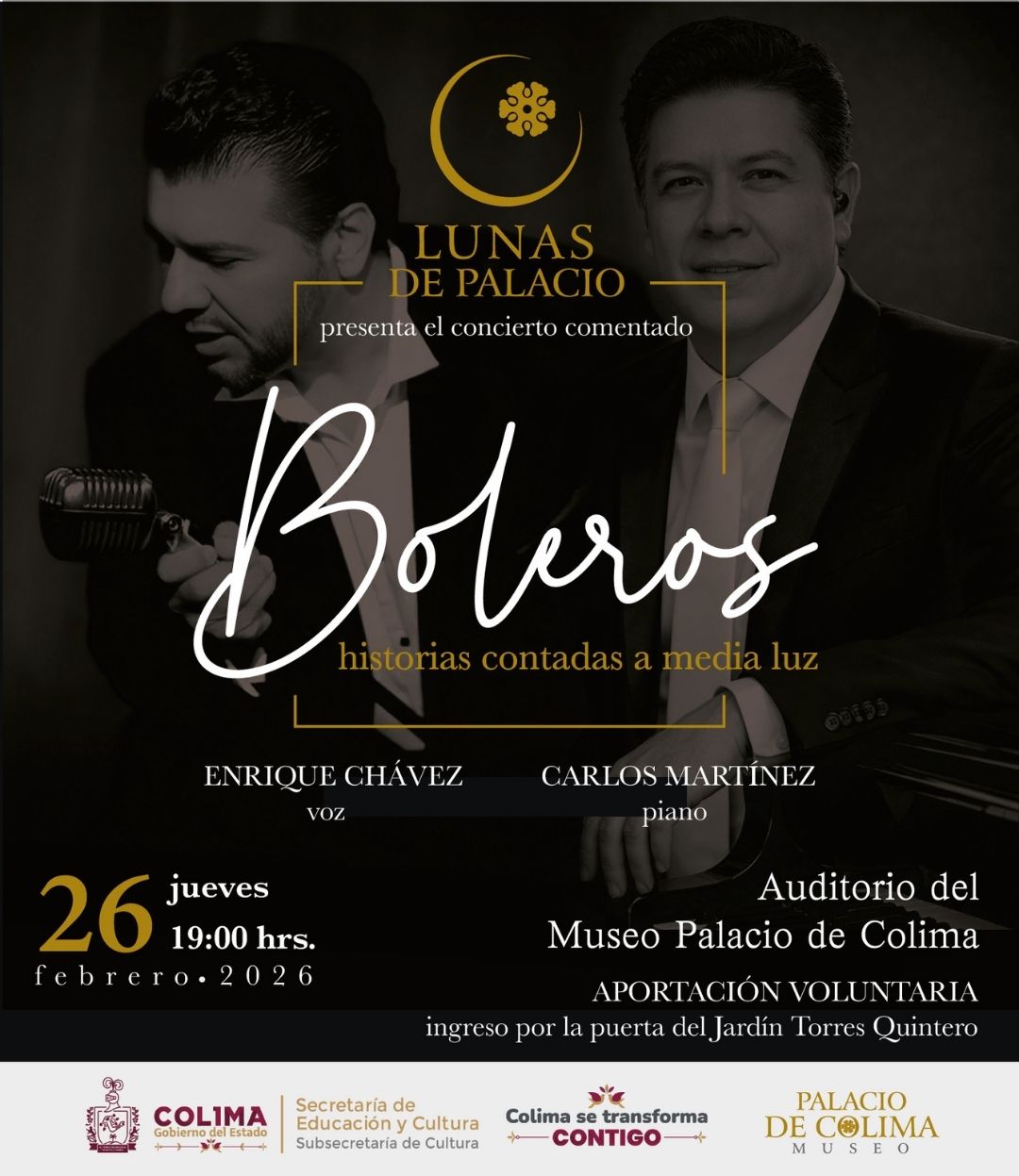 El Gobierno del Estado de Colima, que preside la mandataria Indira Vizcaíno Silva, informa que a través de la Subsecretaría de Cultura reactivará el programa ‘Lunas de Palacio’ con una nueva temporada de funciones artísticas que inicia este jueves 26 de febrero con el concierto Boleros: historias contadas a media luz, con la participación de los músicos Enrique Chávez en la voz y Carlos Martínez en el piano.
