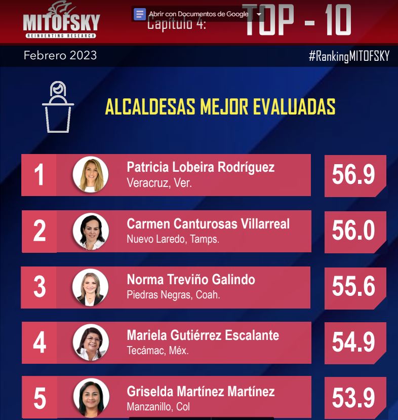 De acuerdo con los estudios que mes a mes desempeña la empresa Consulta Mitofsky en el territorio nacional, en lo que respecta al mes de febrero de 2023, la presidenta de Manzanillo, Griselda Martínez obtuvo la posición número 6, como mejor alcaldesa en una evaluación realizada por cada una de las 32 entidades federativas del país.