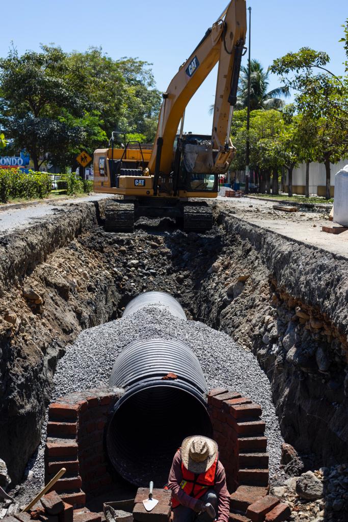 La obra de sustitución del colector de alcantarillado sanitario se desarrolla desde la calle Guayabo hasta el CENDI del Barrio 2 y la construcción de la red de descargas domiciliarias desde la avenida Manglares hasta el CENDI del Barrio 2 en el Valle de las Garzas.