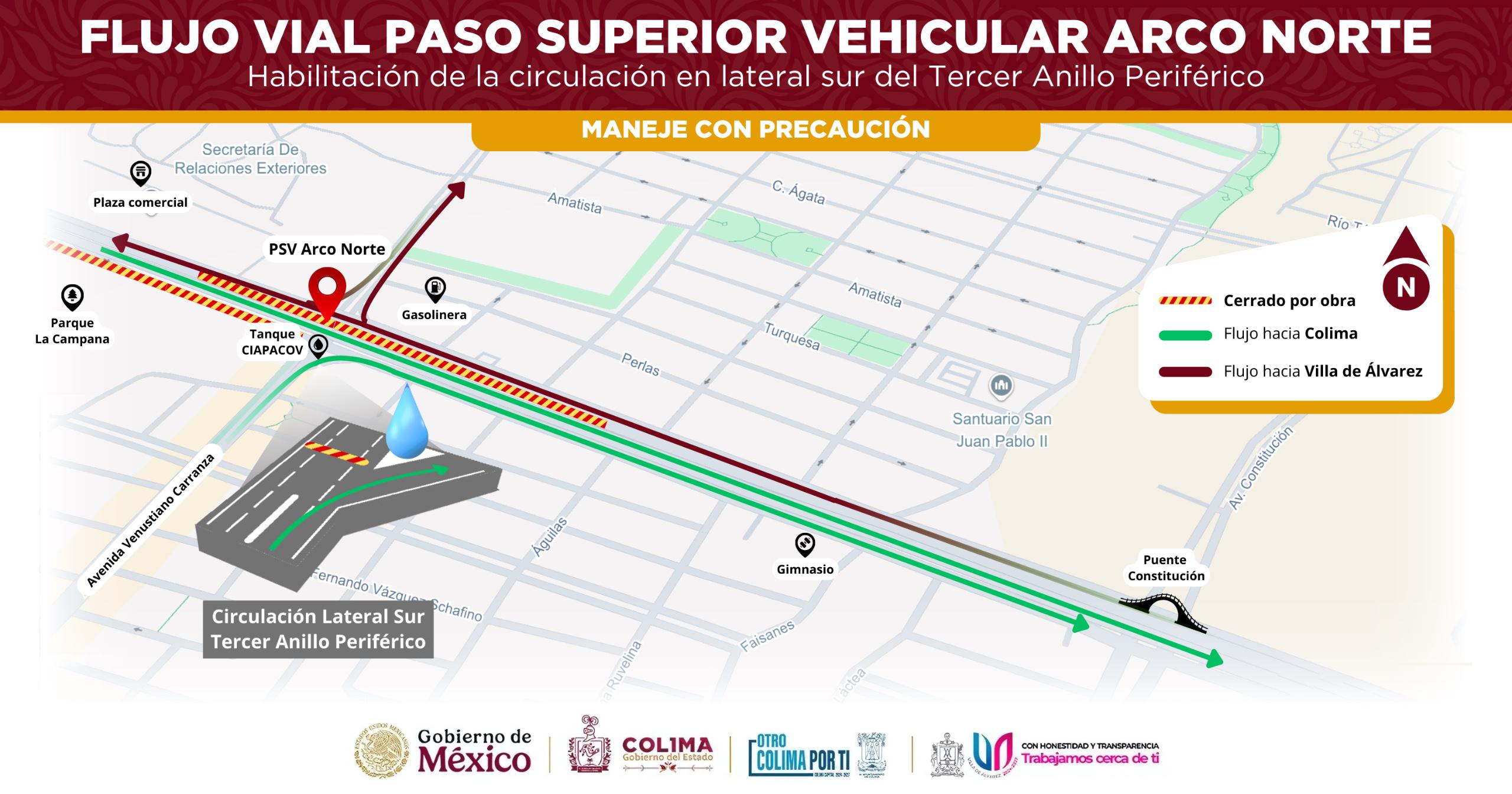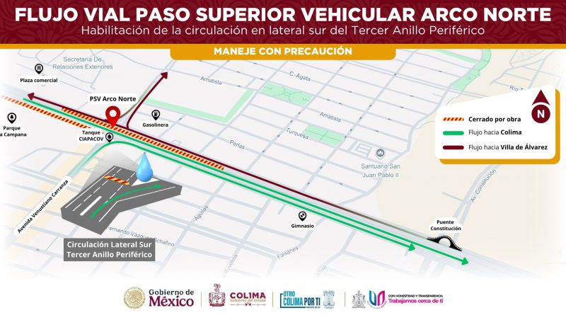 Este miércoles 20 de agosto se ha habilitado la circulación en la lateral sur del Tercer Anillo Periférico, en sentido Villa de Álvarez a Colima, a la altura del tanque de Ciapacov, informa el Gobierno del Estado de Colima.