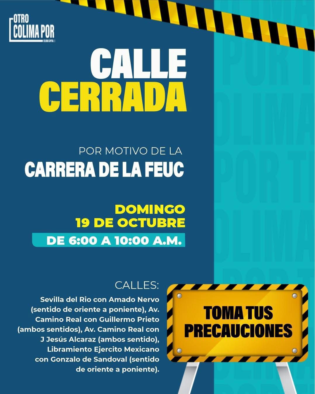 Colima, Col., 18 de octubre de 2025.— El Ayuntamiento de Colima informa a la ciudadanía que este domingo 19 de octubre, de 6:00 a.m. a 10:00 a.m., se realizarán cierres parciales en diversas vialidades de la capital con motivo de la Carrera FEUC–UdeC, un evento deportivo que promueve la salud, el deporte y la convivencia familiar.