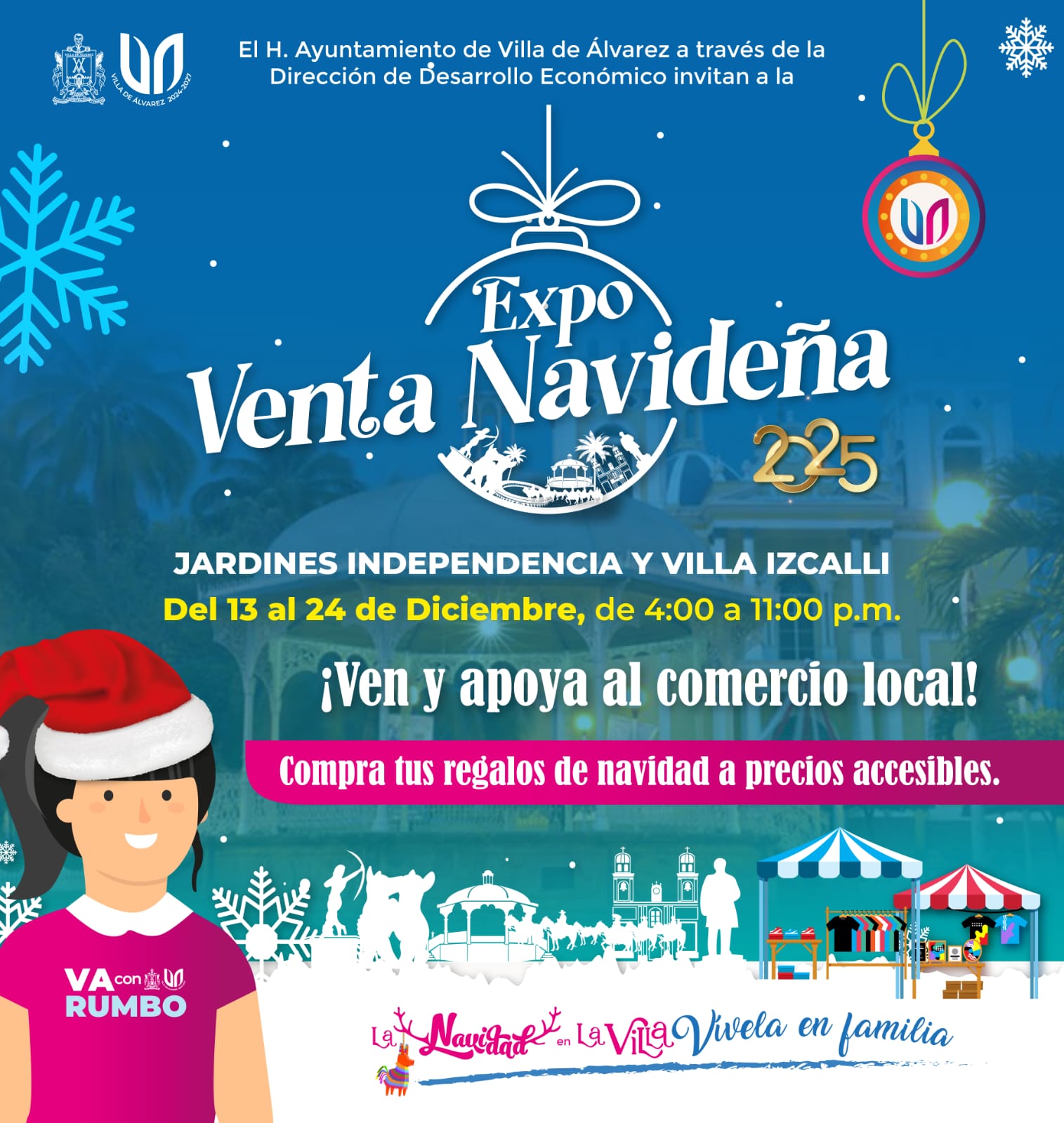 Villa de Álvarez, Col.- Con el objetivo de apoyar a los comercios locales y acercar a la población la venta de productos para la temporada, el Gobierno Municipal de Villa de Álvarez, a través de la Dirección de Desarrollo Económico, celebrará la Expo-Venta Navideña 2025, donde participarán comercios y emprendedores de Villa de Álvarez.