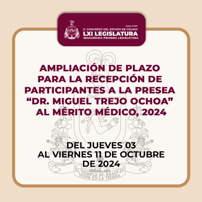El Honorable Congreso del Estado Libre y Soberano de Colima amplió la convocatoria hecha a los Ayuntamientos de la Entidad, a los Colegios de Profesionistas, Organismos Públicos, Instituciones Públicas, Instituciones Educativas Públicas y Privadas, Asociaciones y Sociedades Civiles, y a la Ciudadanía en General, para inscribir a aquellas personas que tengan una destacada trayectoria y aportaciones en el ámbito médico, merecedoras de la Presea “Dr. Miguel Trejo Ochoa”, en su edición 2024. El plazo para la entrega de propuestas se extiende desde este jueves 03 al viernes 11 de octubre del presente, de 09:00 a 15:00 horas, en la Secretaría General del H. Congreso del Estado de Colima, ubicada en Calzada Pedro A. Galván, esquina con calle Los Regalado S/N, Zona Centro, de Colima, Colima.