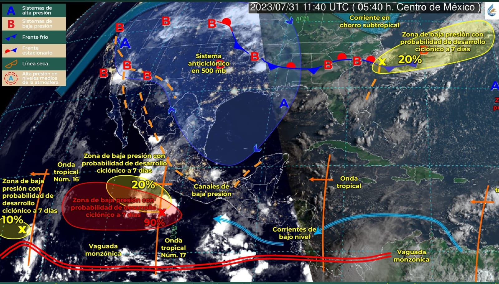 La Unidad Estatal de Protección Civil (UEPC) del Gobierno del Estado de Colima mantiene en vigilancia la onda tropical número 17, que este lunes se desplazará sobre el occidente de la República Mexicana, al igual que la zona de baja presión con alta probabilidad asociada para desarrollo ciclónico, pues podría convertirse en ciclón tropical al sur de las costas de Colima y Michoacán.