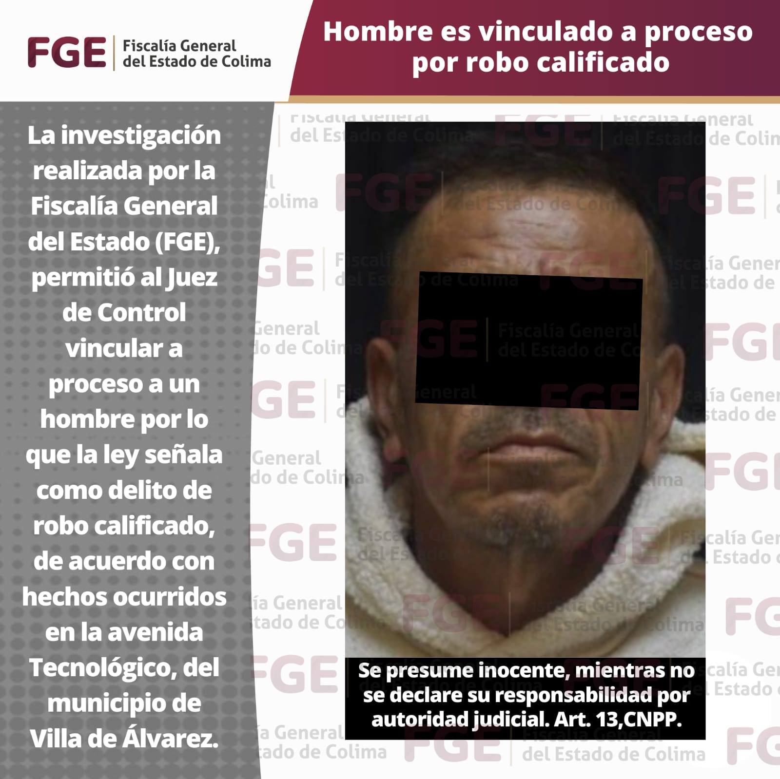 La investigación realizada por la Fiscalía General del Estado (FGE), permitió al Juez de Control vincular a proceso a un hombre por lo que la ley señala como delito de robo calificado, de acuerdo con hechos ocurridos en la avenida Tecnológico, del municipio de Villa de Álvarez.